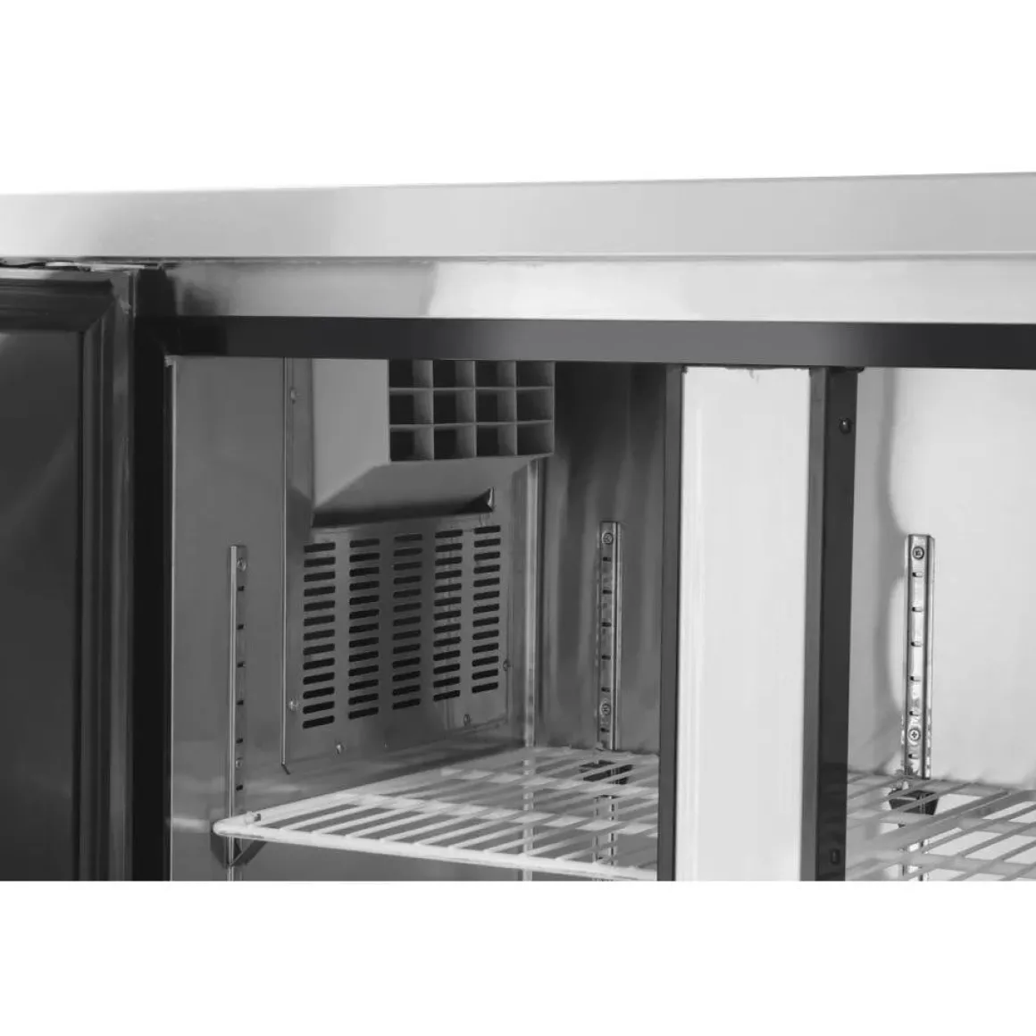 Ruime koelwerkbank met 2 schappen en een bodem waar je producten kan stallen. Het grote blad biedt veel werkruimte en heeft een spatrand.