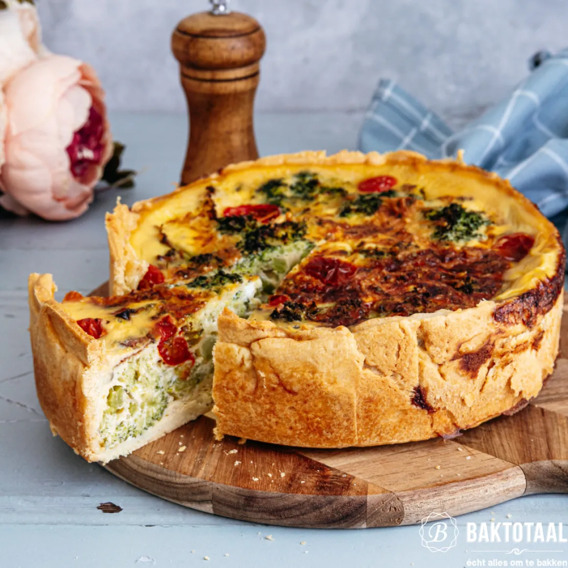 - Rol het deeg (dun) uit en bekleed een ingevette taartvorm. De zijkanten van het deeg laat je over de vorm hangen. Prik vervolgens met een vork enkele gaatjes in het deeg