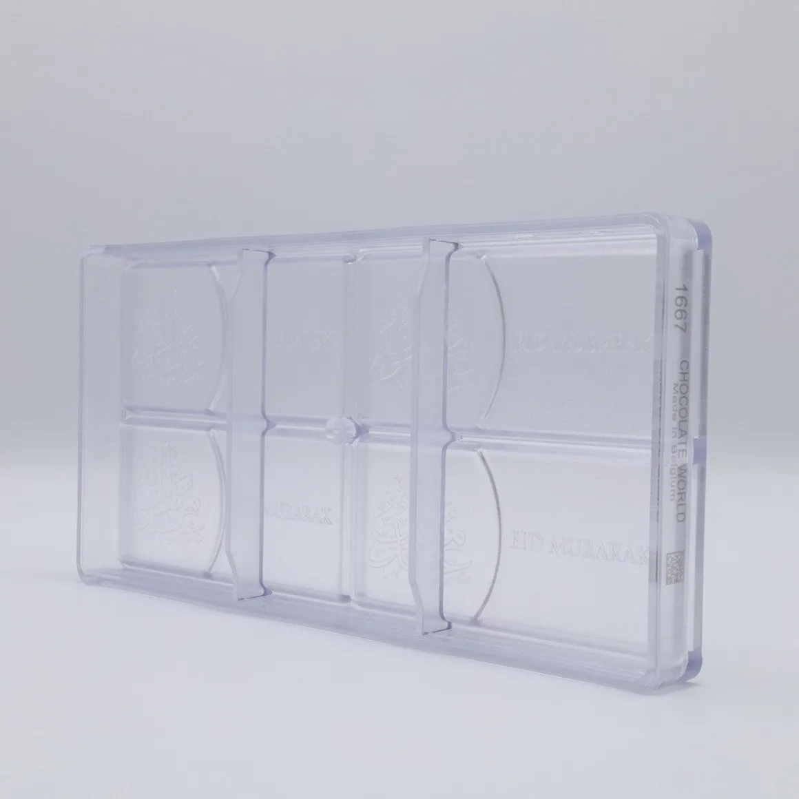 De Chocolademal Chocolate World Tablet Eid Mubarak (4x) is perfect om chocoladerepen te maken voor feestelijke gelegenheden. Deze repen zijn 12,5 centimeter lang, 5,5 centimeter breed en 0,7 centimeter dik. In de mal kun je 4 repen tegelijk creëren.