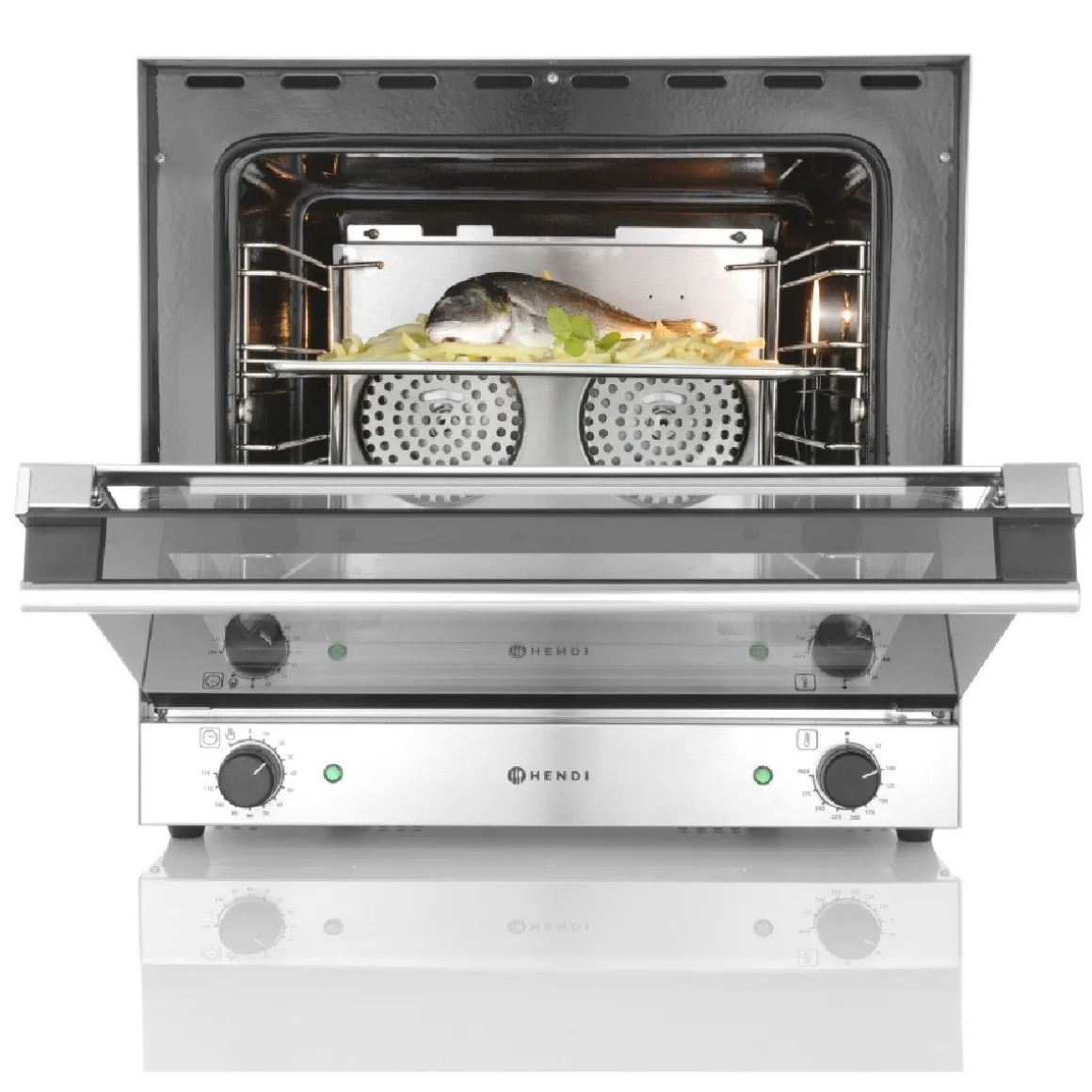 De Hendi Heteluchtoven H90 heeft een roestvrijstalen behuizing. De deur bestaat uit dubbel glas, kan verwijderd worden en heeft een cool touch. Binnenin is de oven gedeeltelijk geëmailleerd en zit er verlichting. Het verwarmen gaat middels 2 elementen en 2 ventilatoren. De oventemperatuur kan ingesteld worden van 50˚C tot 300˚C en de timer tot 120 minuten. Bij gebruik kunnen er maximaal 4 bakplaten in die, als je ze allemaal gebruikt, een ruimte van 7 centimeter ertussen hebben.