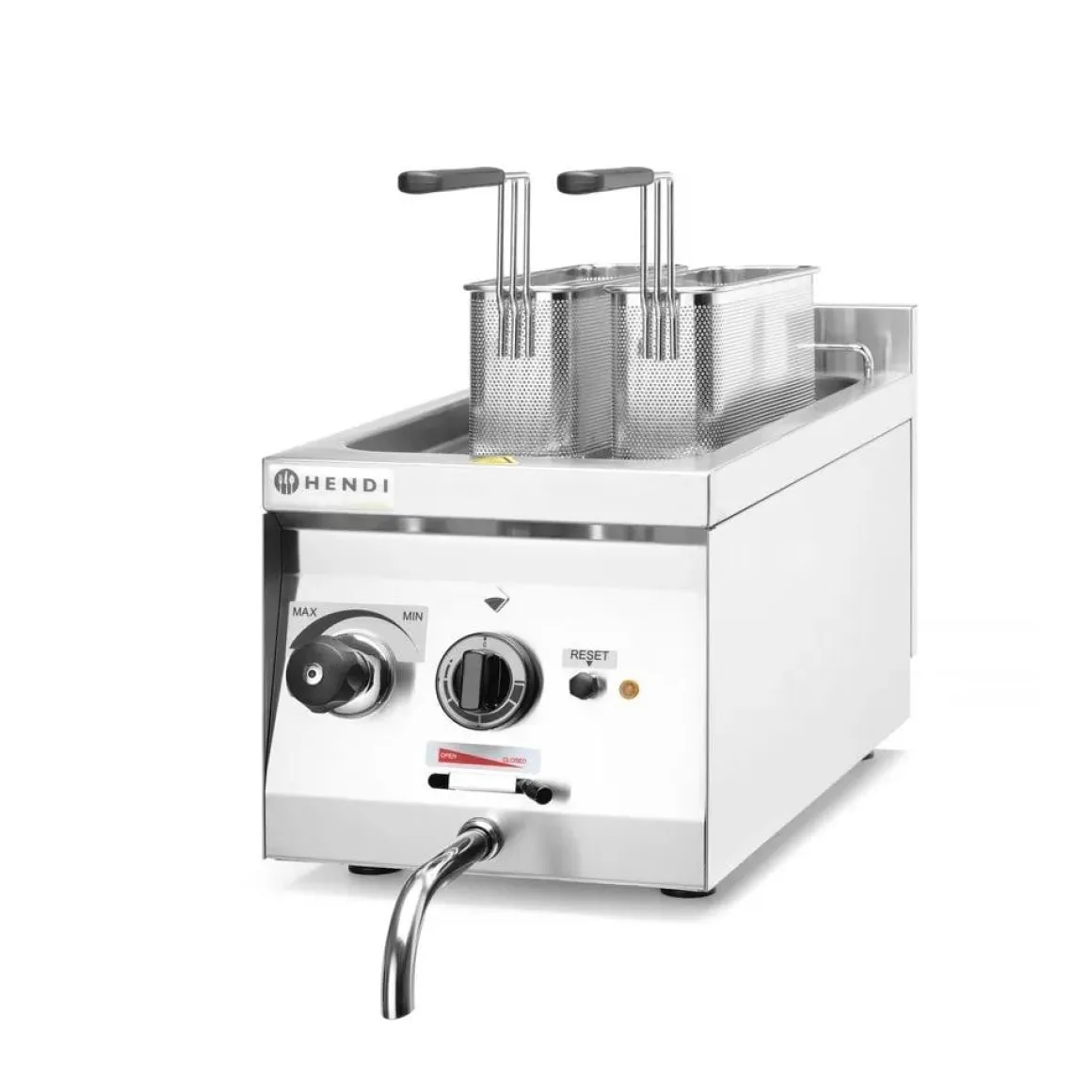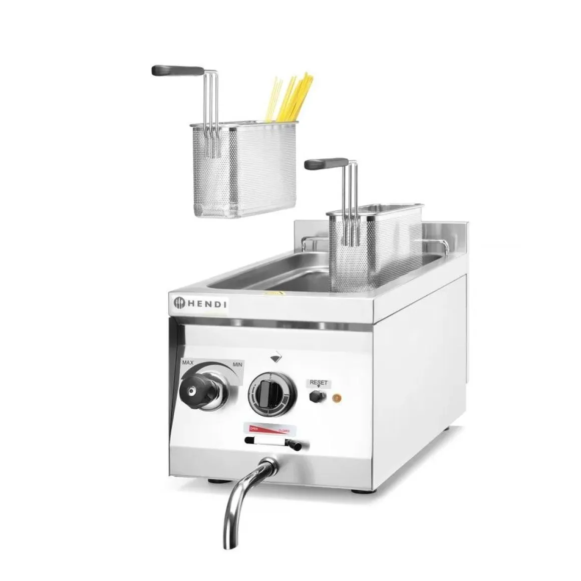 Voor het koken van pasta, dumplings en ook groenten. Deze uitvoering is vervaardigd uit roestvast staal AISI 304. Overige delen van de behuizing (zonder werkblad) van roestvast staal AISI 430. Deze uitvoering is vervaardigd uit roestvast staal AISI 316, met een inhoud van 10 L. Het verwarmingselement bevindt zich aan de onderkant van de container. Directe aansluiting op water. Ventieldraaiknop voor vers water op het bedieningspaneel aan de voorzijde. Temperatuuraanpassing met een draaiknop in het bereik: van 30°C tot 120°C. Indicatielampje informeert over het bereiken van de ingestelde temperatuur. Afneembare uitloop voor gebruikt water. Houder voor manden bedoeld voor het uitlekken van de inhoud. Mechanische vergrendeling om te voorkomen dat de afvoerkraan per ongeluk wordt geopend. Oververhittingsbeveiliging met reset op het bedieningspaneel aan de voorzijde. Antislipvoetjes. Inclusief: 2 manden 100x292x(H)158 mm en een deksel. Het apparaat wordt geleverd zonder stekker.
