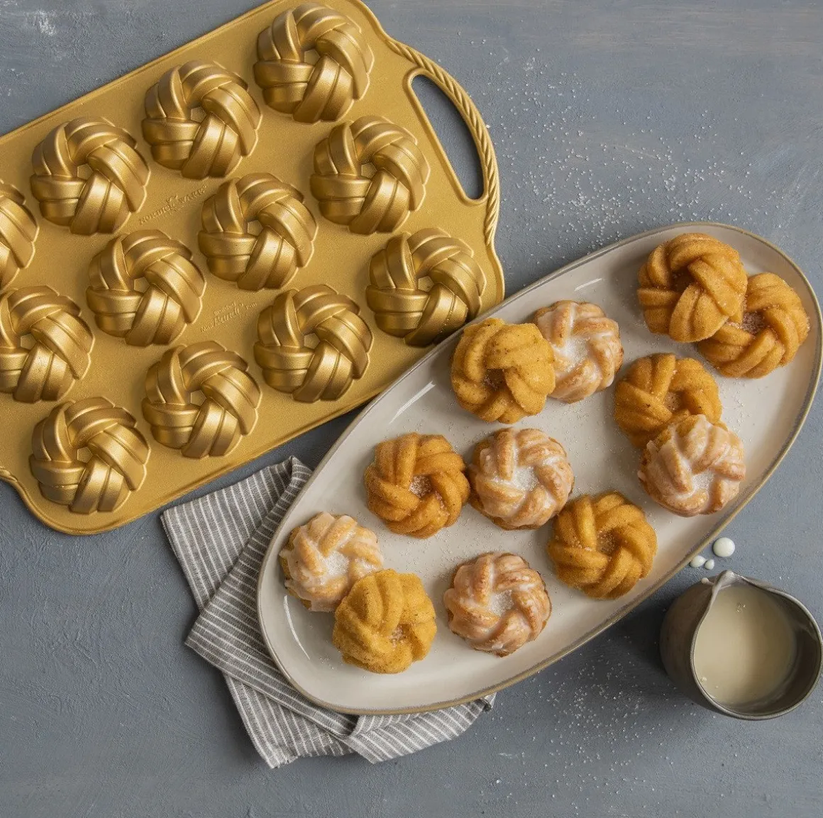 Ter ere van het 75-jarige jubileum van Nordic Ware hebben ze twee prachtige ‘braided’ vormen ontworpen. Deze mini-variant is er daar één van. De eenvoudige, maar mooi strak verweven strengen symboliseren continuiteit, saamhorigheid en kracht. De Braided Bundt heeft gladde gebogen banden die als golven stromen in een wervelende, nooit eindigende cirkel.