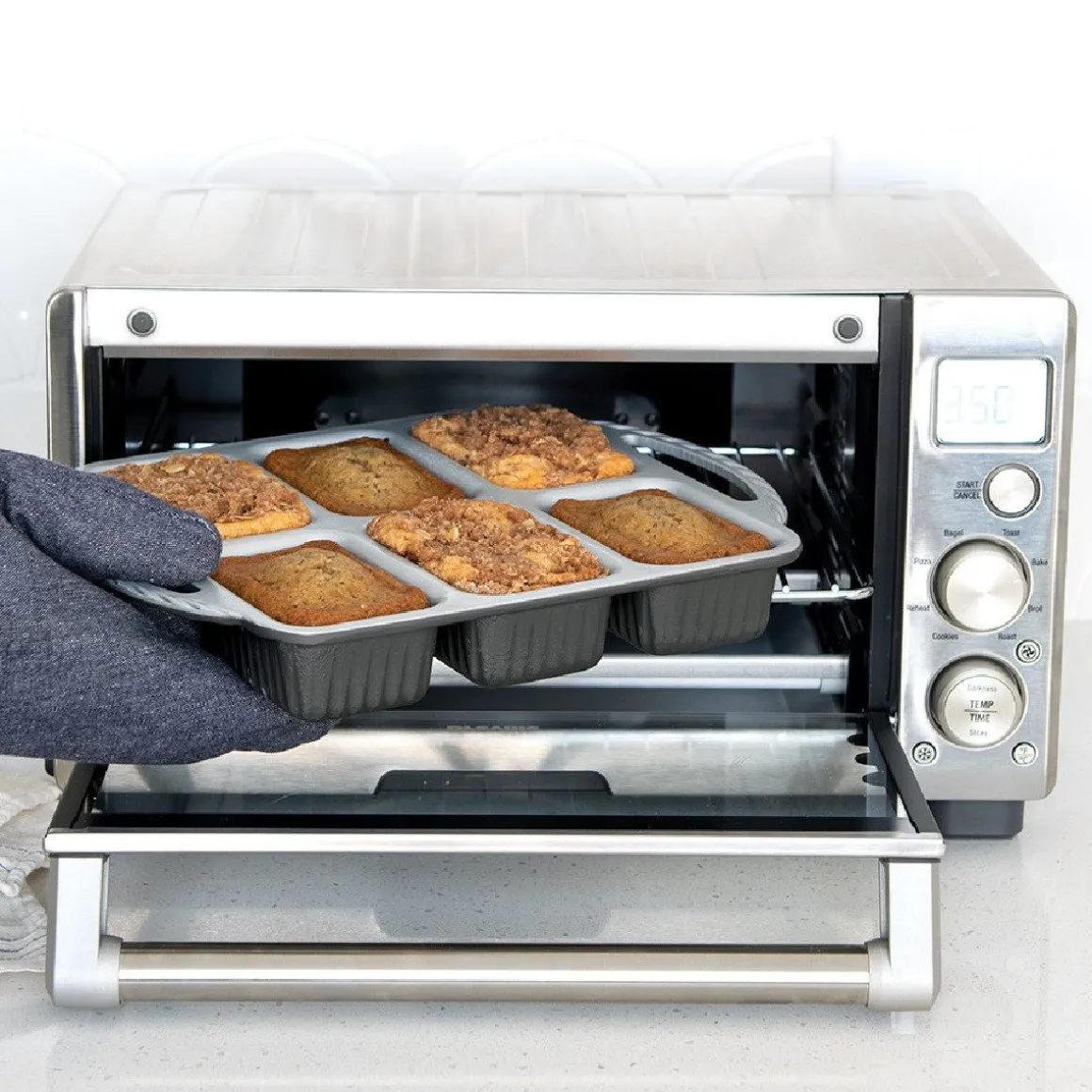 De Nordic Ware ProCast Mini Loaf Bakvorm is een hoogwaardige bakvorm waarmee je eenvoudig zes perfect gevormde mini-cakes of broodjes tegelijk kunt bakken. Deze stevige vorm is gemaakt van professioneel gietaluminium, wat zorgt voor een optimale warmteverdeling en een gelijkmatige garing van je baksels. Dankzij de duurzame antiaanbaklaag komen de mini-loaves moeiteloos los, zonder dat er restjes achterblijven. Ideaal voor het maken van kleine cakes, bananenbrood, mini-gehaktbrood of zelfs hartige creaties zoals kleine quiches.