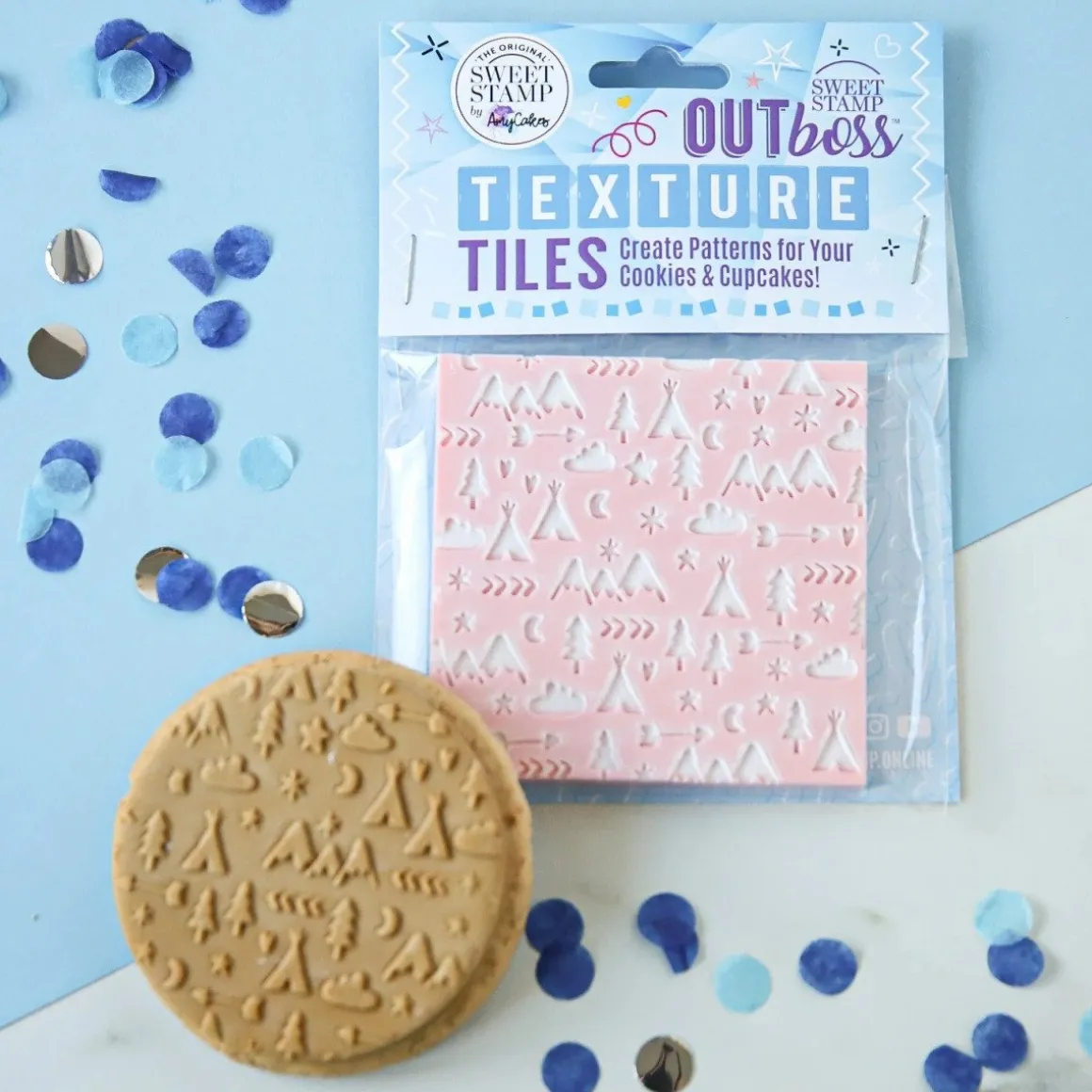 Breng het avontuur aan op je baksels met de Sweet Stamp Outboss Camping! Deze handige textuurplaat geeft een speels patroon met onder andere tentjes en bomen. Perfect voor kampeerthema’s.