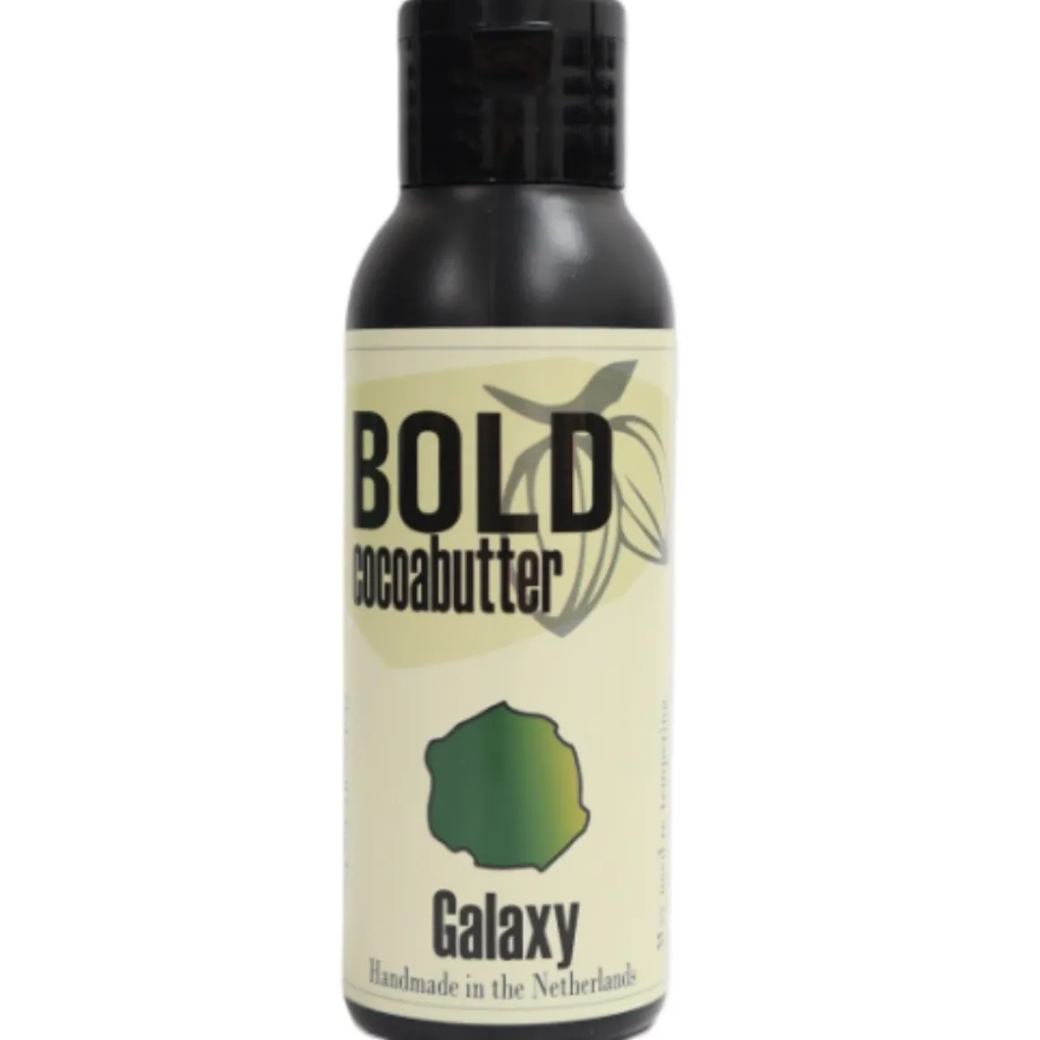 De Bold Cacaoboter Gekleurd Galaxy Glitter 80g heeft een donkere kleur groen gevuld met glitters. De cacaoboter is voor het kleuren van allerlei soorten chocolade te gebruiken, zoals witte en pure chocolade. Een voordeel van deze kleur is dat deze een perfecte dekking heeft. De kleur blijft hetzelfde, ongeacht het soort chocolade dat je ermee kleurt. Het flesje bevat 80 gram en is ook leverbaar in 230 gram.