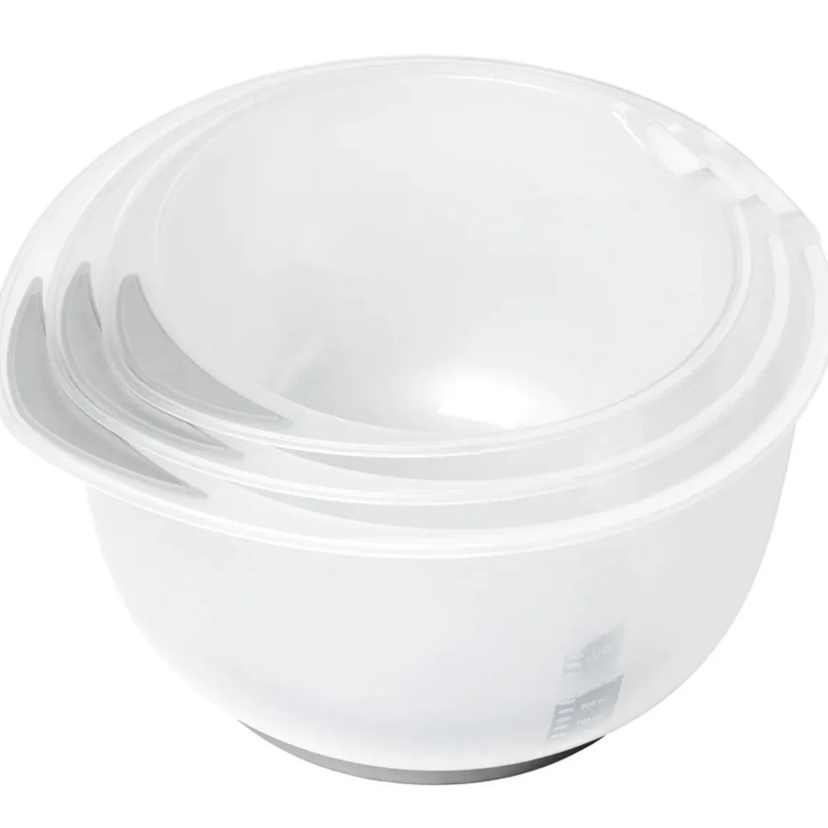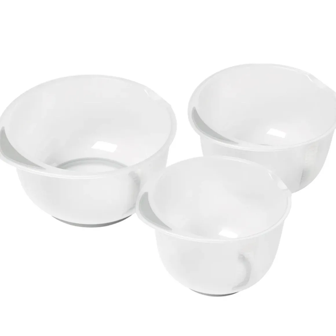 De ChefAid Beslagkommen met Anti-Slip Set/3 heeft in de verpakking 3 verschillende maten beslagkommen. De kleinste kom is 1,5 liter, de middelste 2 liter en de grootste 2,5 liter. De kommen zijn erg handig om diverse beslagen en degen in te mixen, maar je kunt er bijvoorbeeld ook salades of andere gerechten in maken. De onderkant van elke kom heeft een antislip rand, waardoor de kommen stevig blijven staan.