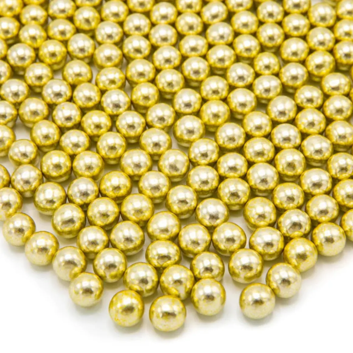 Chocolade Parels M Gold Metallic 90g: Voeg een vleugje luxe toe aan je baksels met de Chocolade Parels M Gold Metallic 90g. Deze schitterende decoratie is perfect voor het versieren van taarten, cupcakes en ijs!