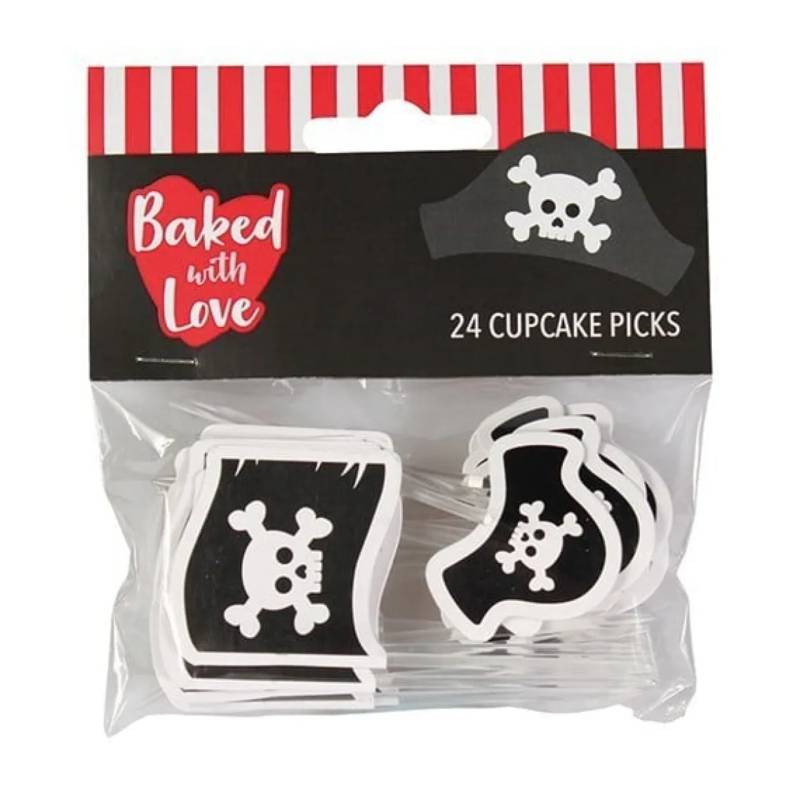 Maak de (cup)cakes, muffins en taarten voor een piraten feestjes helemaal af met deze leuke decoratie prikkers. De prikkers hebben de vorm van een piratenvlag en een piraten hoed met beide een doodshoofd afgebeeld. Perfect in combinatie met piraten cupcake cups (artikelnummer CAI330). Maak de cupcakes af met een boter crème of glazuur en leuke piraten decoratie.