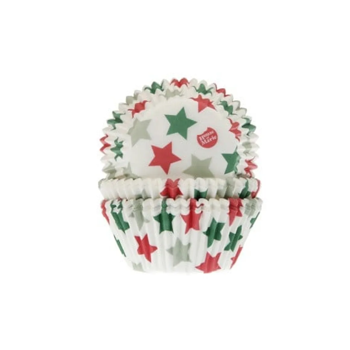 Cupcake vormpjes met sterren in de Kerst-kleuren (groen, rood en zilver). Deze cupcake cups zitten per 50 stuks verpakt.