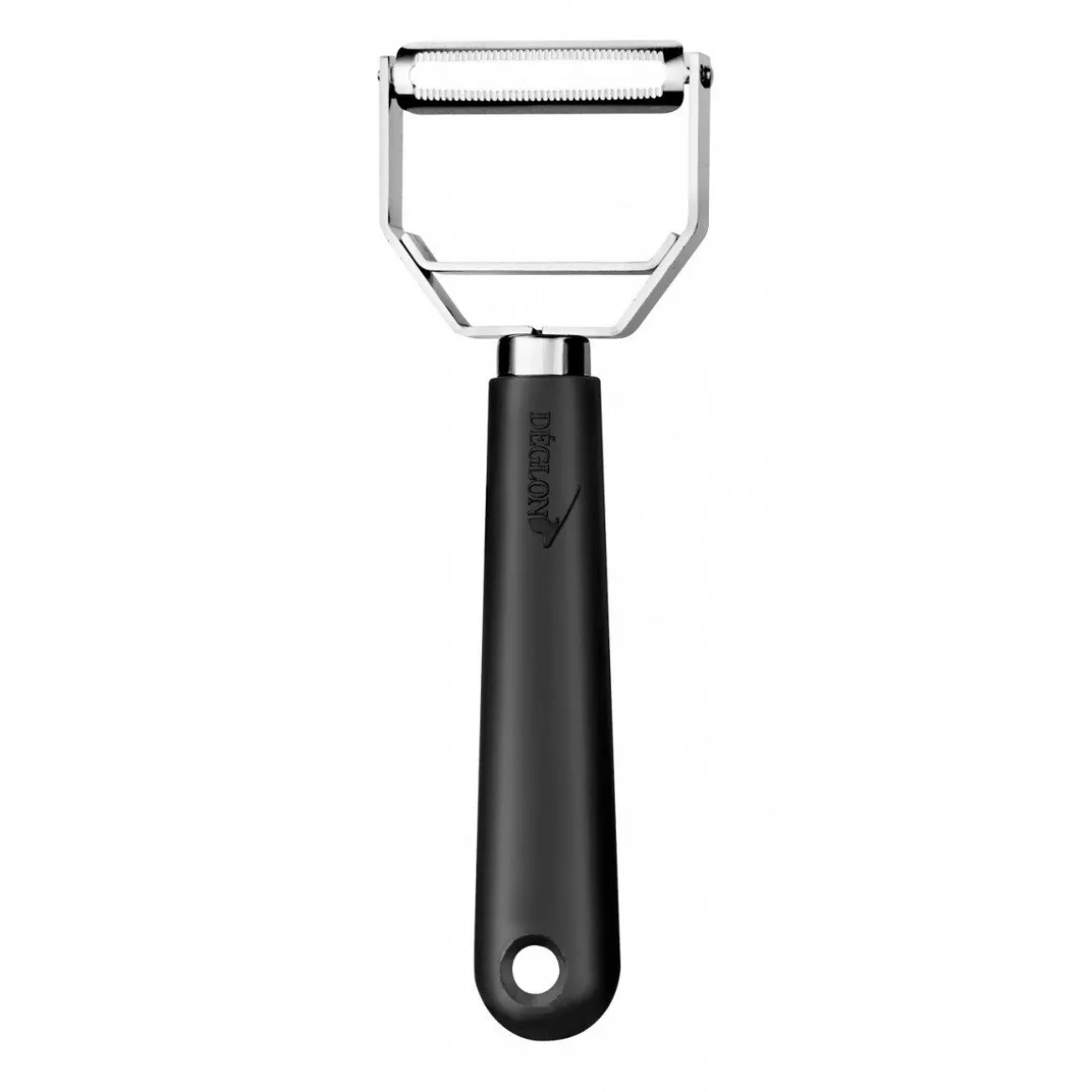 Verwijder eenvoudig je dikkere of dikkere schillen van fruit of groenten met de dunschiller van het merk Déglon. Het schilmes heeft een draaibare stijgbeugel, wat het verwijderen van de schillen een stuk makkelijk maakt. De schiller heeft een robuuste RVS beugel, met een dikte van 1,8 mm. Geen schil is veilig met deze handige dunschiller.