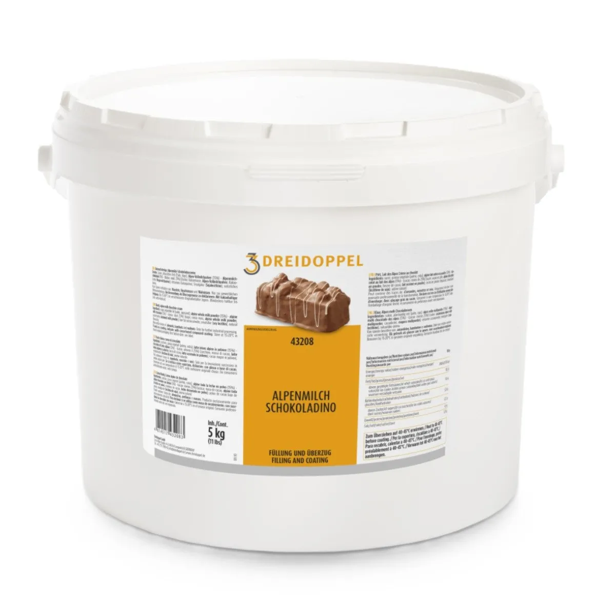 Deze Dreidoppel Chocolade Coating Melk 5kg is een gebruiksklare crème op basis van 15% alpenmelkpoeder. De coating komt in een praktische emmer van 5 kilogram en is direct klaar voor gebruik. De structuur is stevig en blijft stabiel bij het snijden.