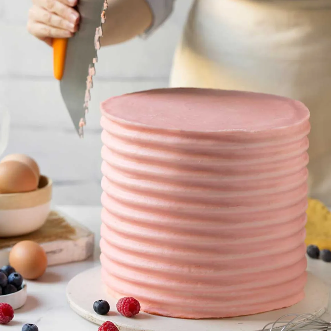 Maak een prachtige lintrand langs je taart met deze Garneerkrabber Lintmodel. Het mes is meer dan 20 cm lang, wat het zelf geschikt maakt voor hogere taarten. De golvende spatel is uitstekend geschikt voor het decoreren van taarten met originele texturen.