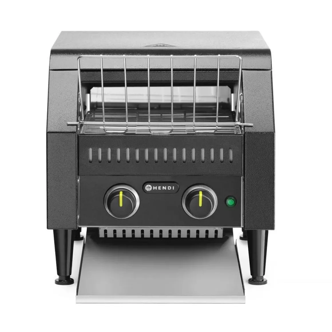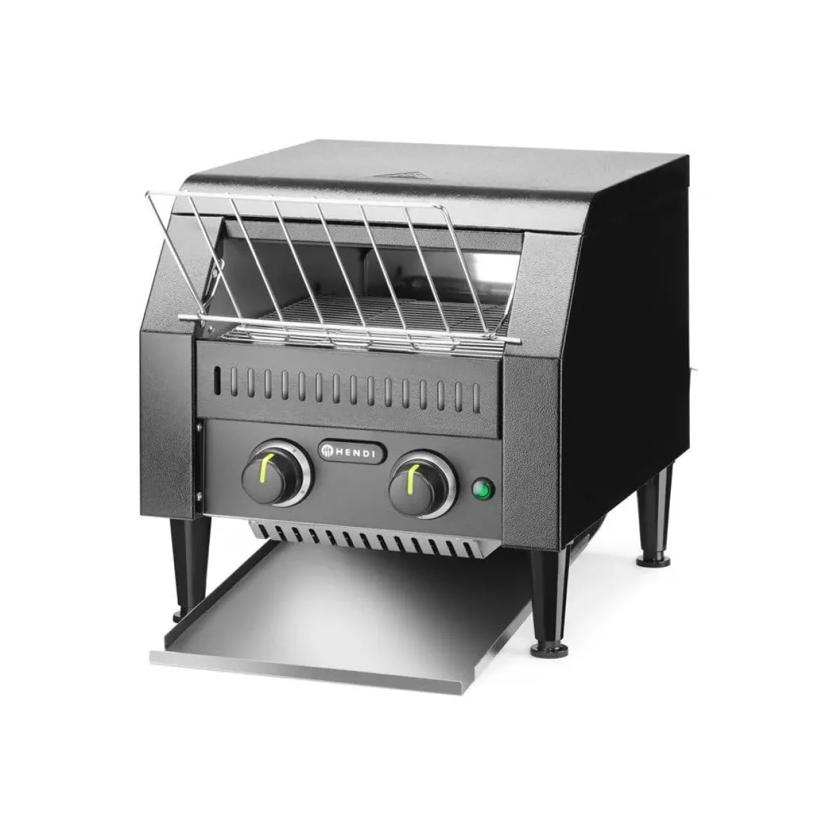 Twee rijen sneetjes passen naast elkaar op de loopband. Voorzien van twee aparte elementen. Uitermate geschikt om te gebruiken bij het doorlopend roosteren van sneetjes brood. Met opvangbak voor en achteren. Instelbare doorlooptijd tot 3 minuten.