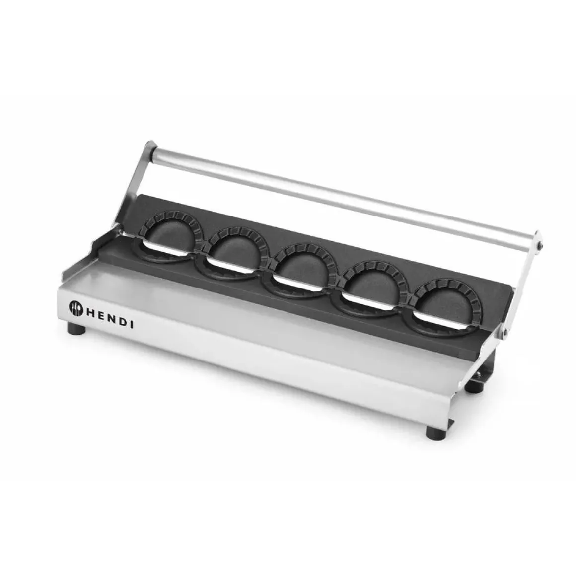 De HENDI Dumpling maker is de oplossing voor het moeiteloos en snel creëren van knoedels/dumplings, door 5 dumplings tegelijk te maken. De mallen zijn afgewerkt met een anti-aanbaklaag, zodat knoedels gemakkelijk kunnen worden verwijderd. De handgreep over de gehele lengte van het apparaat maakt het mogelijk om gelijkmatige druk uit te oefenen op alle vormen. De vier antislipvoeten van rubber garanderen dat de dumpling maker stabiel staat tijdens gebruik.