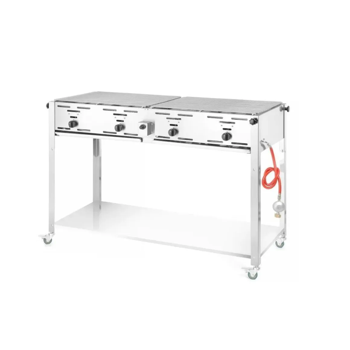 Roestvast stalen frame met 2 vetopvanglades. Uitermate geschikt om te gebruiken bij butaan- en propaangas en uitgerust met 4 onafhankelijk regelbare branders. Geleverd met 2 vernikkelde roosters en 1 geëmailleerde bakplaat ( binnenafmetingen 590x480x(H)55 mm). Thermokoppel en elektronische ontsteking. Inclusief gasslang en drukregelaar. Verbruik 0,8 m³/u. Op onderstel met onderplaat en 4 wielen voor simpel verplaatsen.