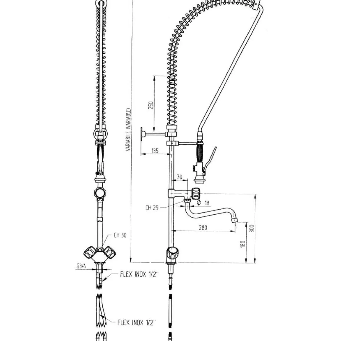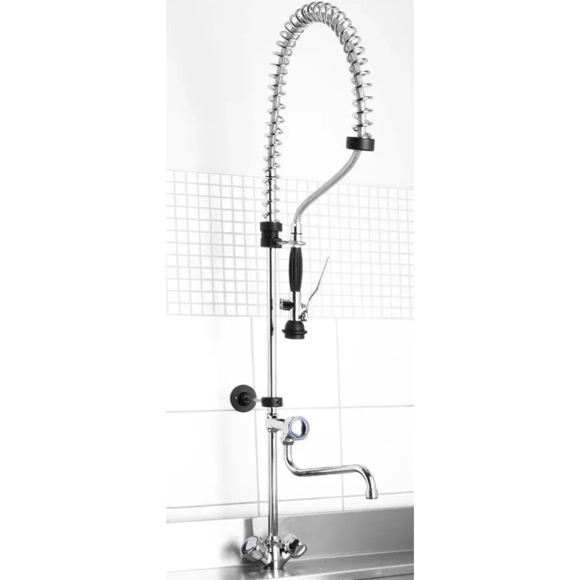 Pilaarkraan met 1 opening. Uitermate geschikt om te gebruiken bij water onder hoge druk. Voorspoeldouche met behuizing van plastic. Verstelbare steun. Muurbevestiging (inkortbaar). Aansluitingen: 1/2”