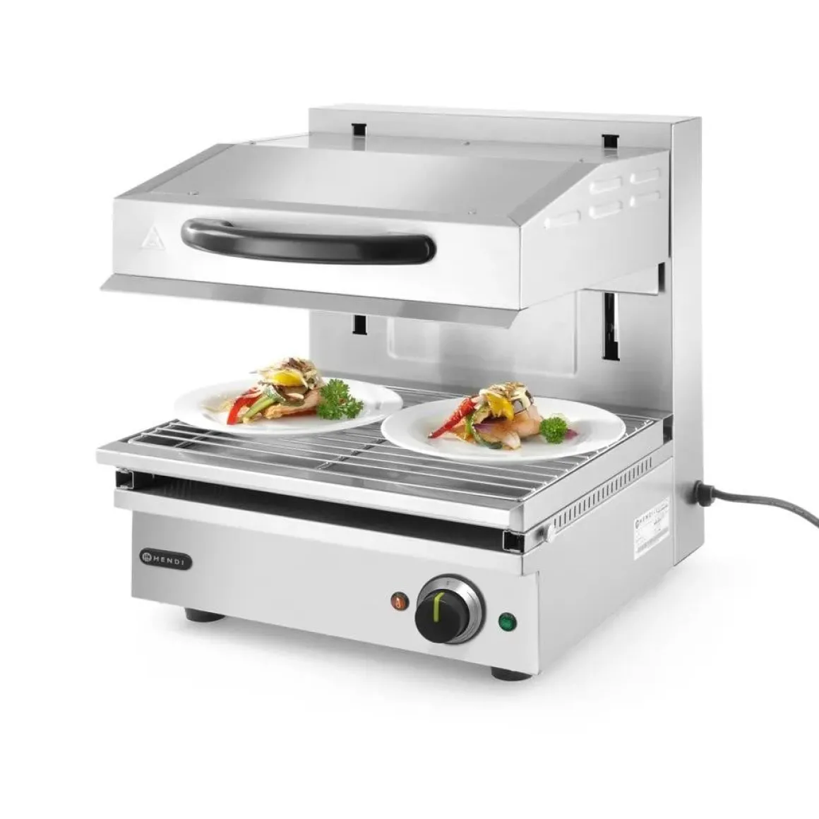 Type 450 – roestvast stalen frame. Ideaal om mee te grillen of gerechten mee te verwarmen. Thermostaat traploos instelbaar tot maximaal 300°C, met controlelampjes. Hoogte variabel instelbaar door licht lopend liftsysteem. Verwijderbare lekbak met rooster van 440×320 mm.