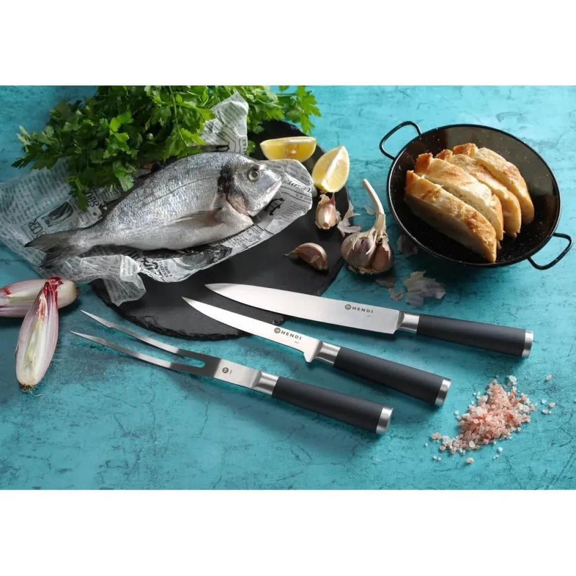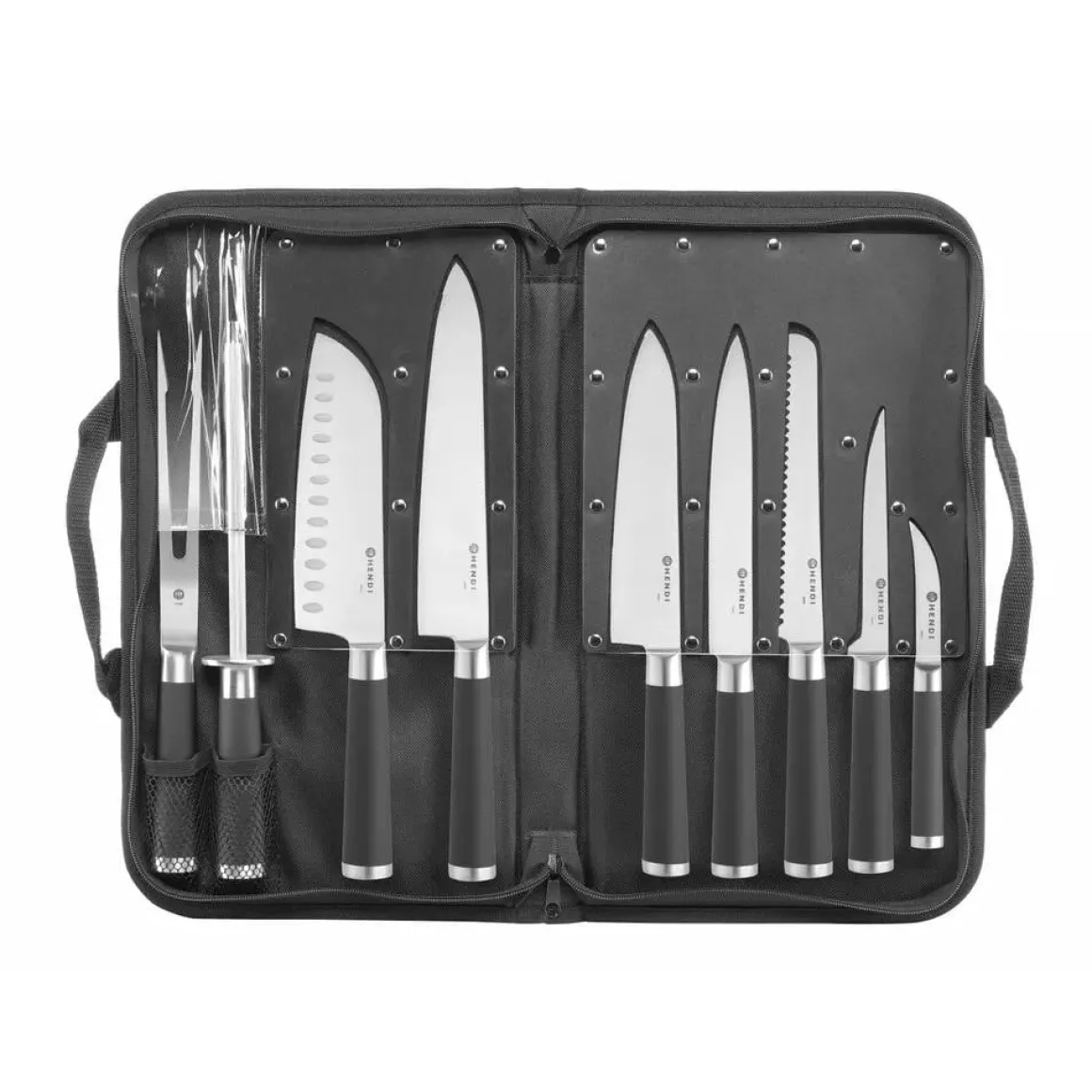 Deze uitvoering is vervaardigd uit Gemaakt van één stuk hard, roestvast staal 3Cr13. Handgreep van roestvast staal 430 met anti-slip rubberen coating. Door de hoogste kwaliteit van het vakmanschap zijn messen duurzaam en bestand tegen corrosie met een langdurige scherpte van het mes. Met veilige, geprofileerde handgreep. De set omvat: