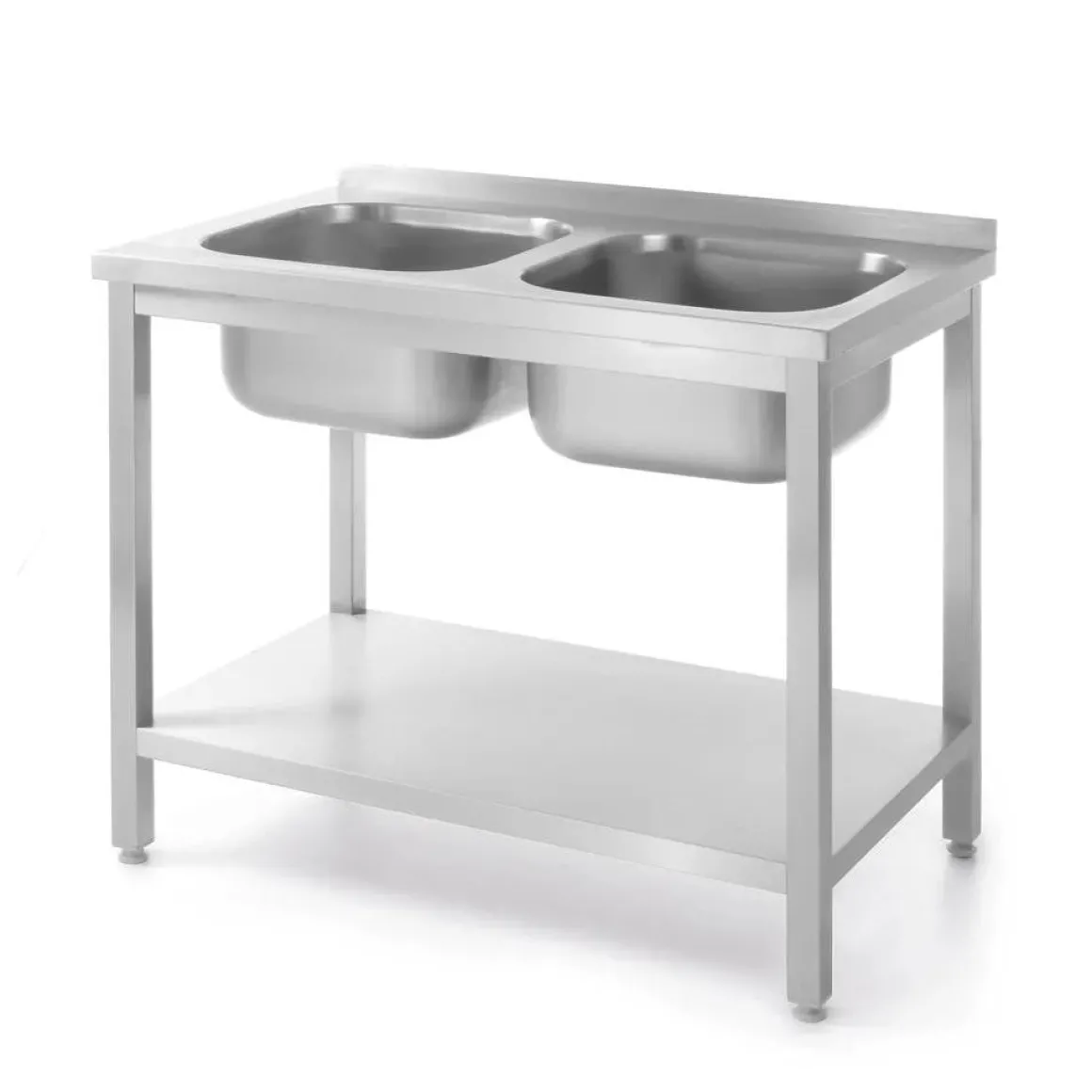Deze uitvoering is vervaardigd uit AISI 430 roestvast staal. 2 spoelbakken (400x400x(H)250 mm), elk geperst uit een enkele plaat roestvast staal, naadloos in het werkblad gelast. Met een opstaande rand van 40 mm hoog. Schap gemonteerd op 160 mm van de vloer, waardoor er voldoende ruimte overblijft voor grotere apparaten en dozen. Zowel het werkblad als het schap hebben een gespreide laadcapaciteit van 70 kg/m2. De poten zijn in hoogte verstelbaar om een waterpas installatie te garanderen (+25/-5 mm). Ø30 mm opening voor een kraan, past op HENDI 970515 en 970508 kranen. Uitermate geschikt om te gebruiken bij standaard afvoeren.