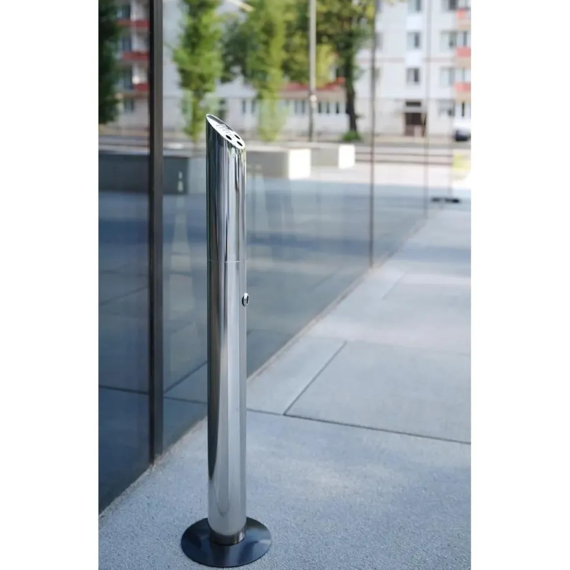 Zeer robuust ontwerp, kan op de vloer gemonteerd worden of vrij staan. Eenvoudig te legen, bovenste deel kan met een sleutel ontgrendeld en vervolgens geleegd worden. Voet is ø170 mm, zuil is ø75 mm.