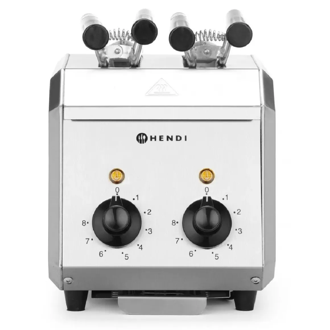 Het Hendi Tosti Apparaat heeft een roestvrijstalen behuizing en de geïsoleerde handgrepen van de de tangen zijn van PF hars. Het apparaat bestaat uit twee gedeeltes die apart van elkaar gebruikt kunnen worden. Ook is het apparaat voorzien van een timer met alarm, die maximaal tot 8 minuten instelbaar is. Het schoonmaken gaat gemakkelijk door de uitneembare kruimellade.