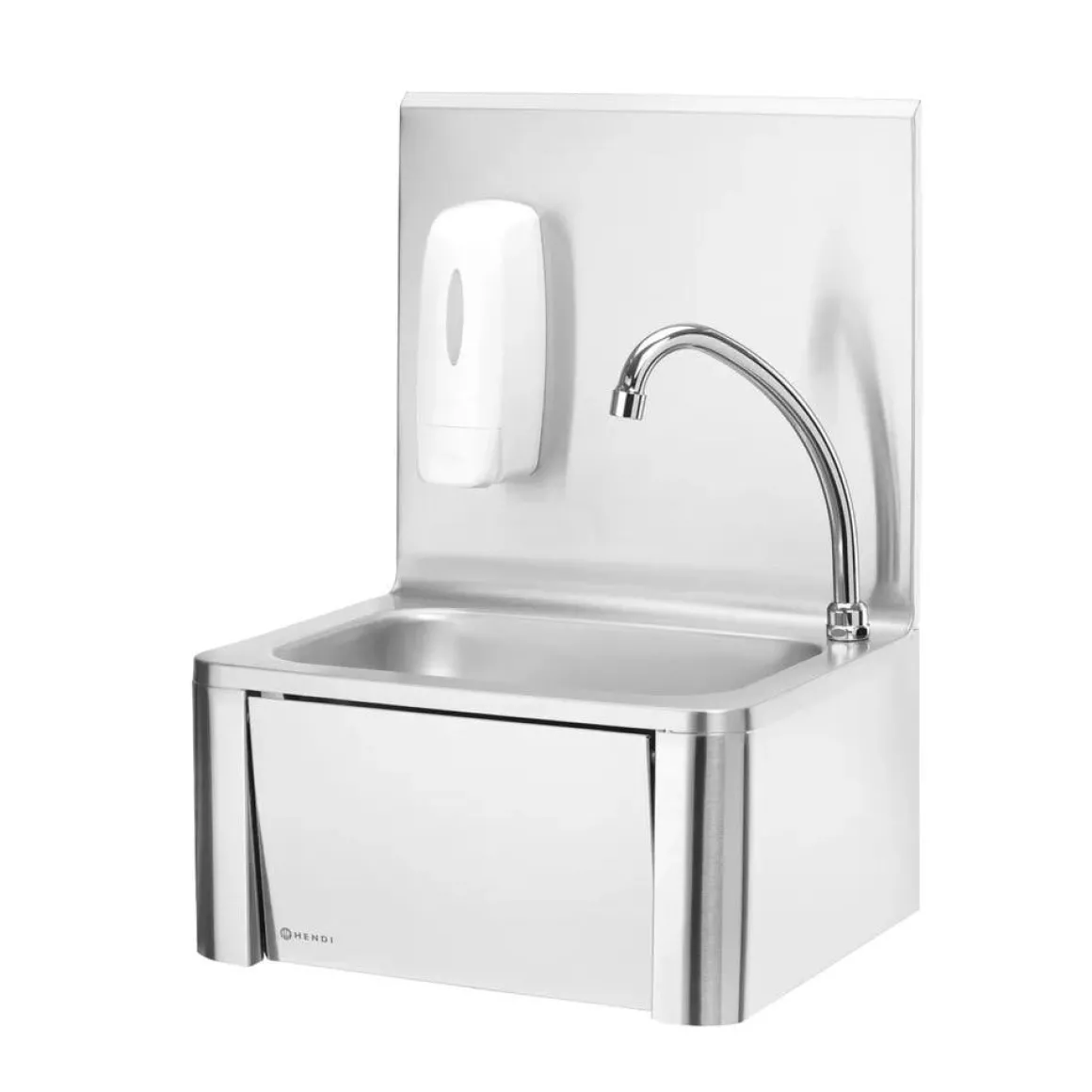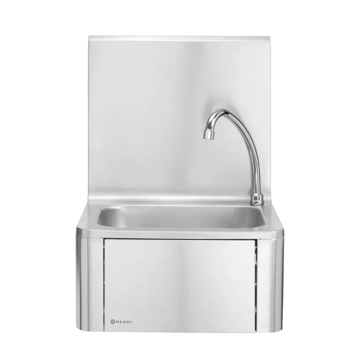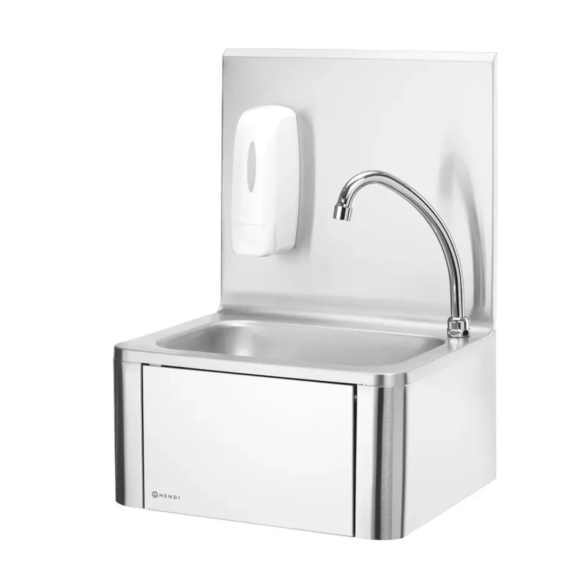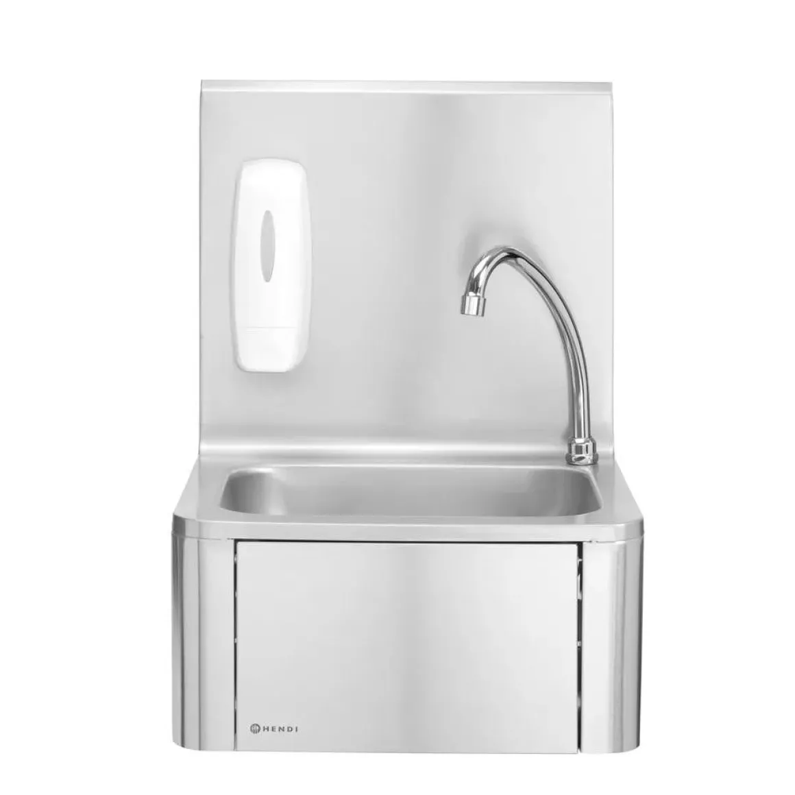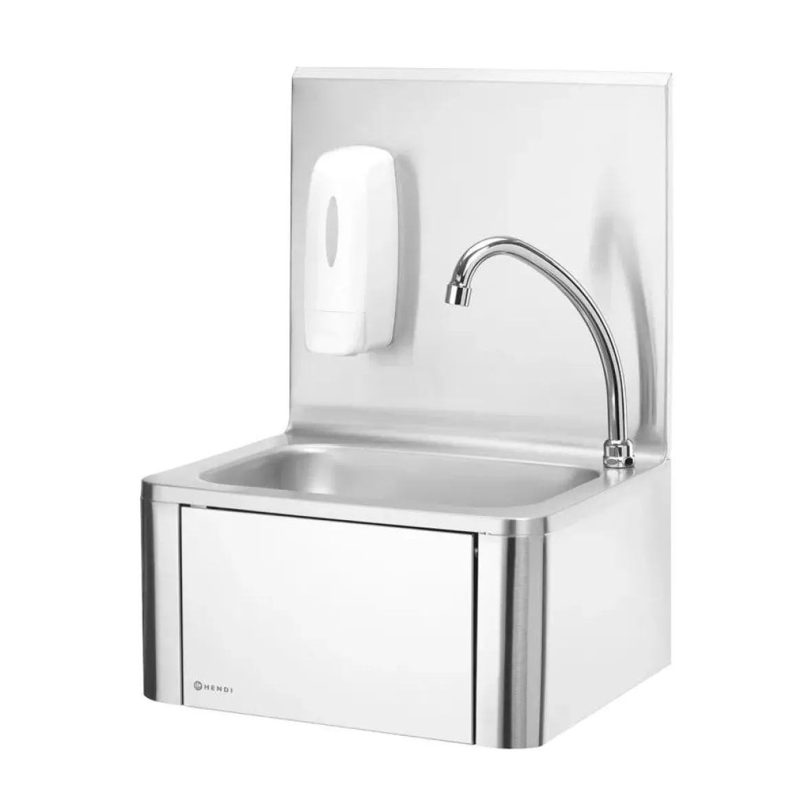 Zet het water op een hygiënische manier aan door simpelweg je knie tegen het voorpaneel te drukken. Voorzien van warm- en koudwatermengkraan welke zich onder het frontpaneel bevindt. Deze uitvoering is vervaardigd uit 18/10 roestvast staal. Wordt geleverd met tuit en zeepdispenser. Afmetingen frontpaneel: 285x(H)185 mm. Afmetingen spoelbak: 330x230x(H)120 mm. Wateraansluiting: 1/2”, afvoergat Ø 52 mm.