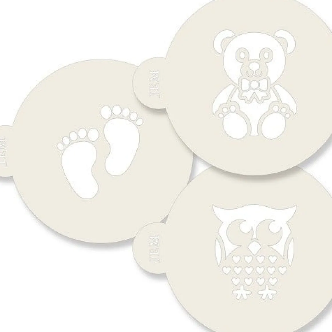Met dit sjabloon maak je prachtige taarten met daarop een lief beertje, een schattig uiltje en twee babyvoetjes. Superleuk voor als je iets wil maken voor een babyshower! Maar natuurlijk ook fantastisch voor andere feestelijke gelegenheden. Gebruik hiervoor diverse technieken als royal icing, brush n fine pen, airbrush en ink pad.