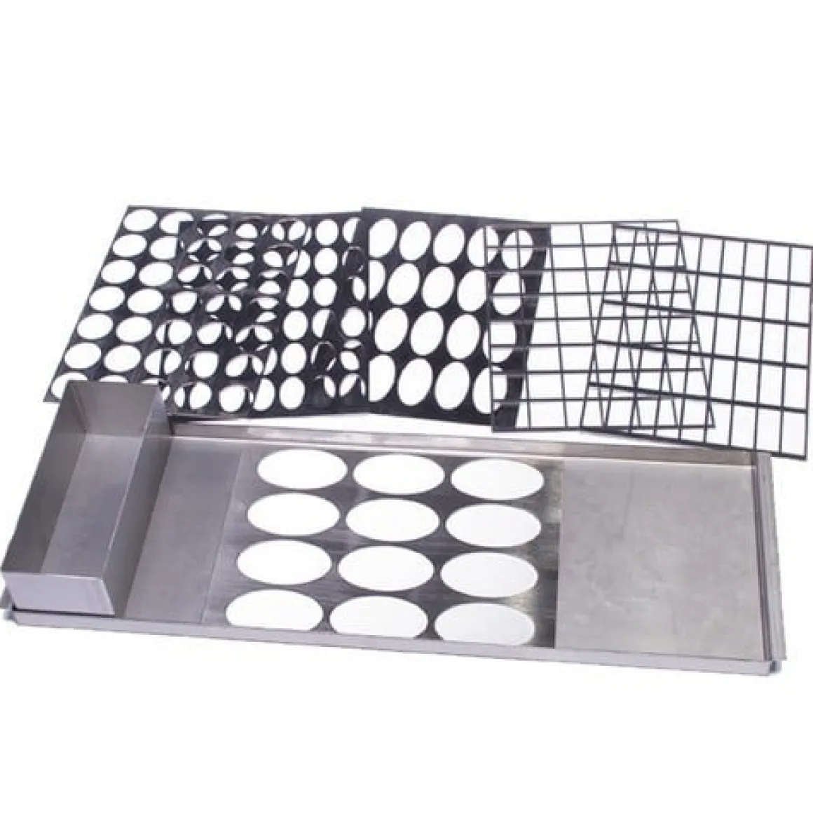 Strijksjabloonbak van RVS met 6 sjablonen, te gebruiken voor het maken van galettes. Print met eetbare inkt op Chocoprint je eigen logo of patroon uit en maak eenvoudig met deze complete set je eigen gepersonaliseerde galettes.