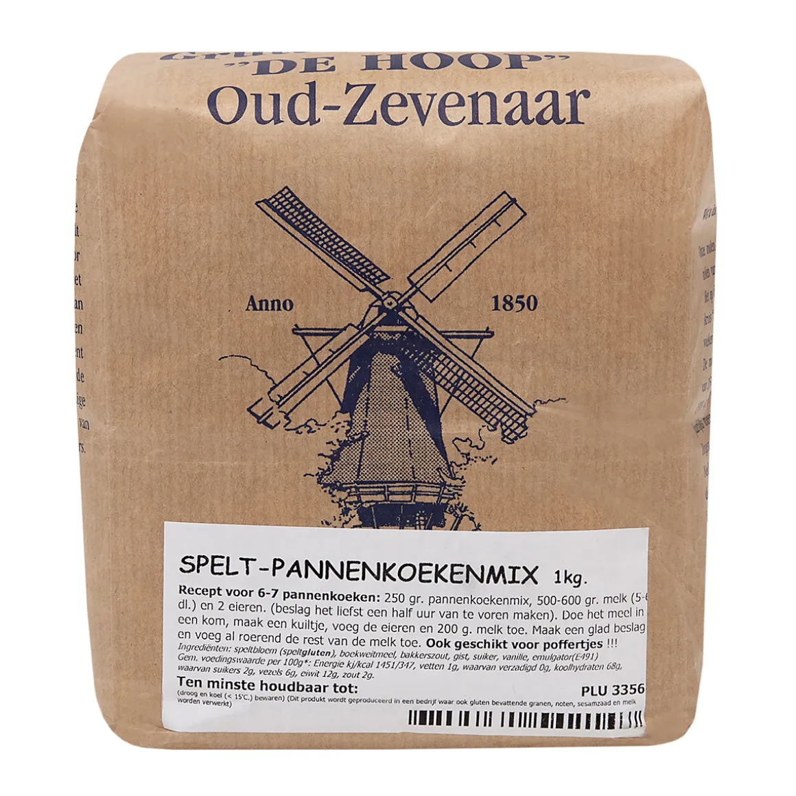 Heerlijke speltpannenkoeken of -poffertjes maken doe je natuurlijk met de Molen de Hoop Spelt Pannenkoekenmix. De mix bevat en suiker en zout, voor een heerlijke smaaksensatie.