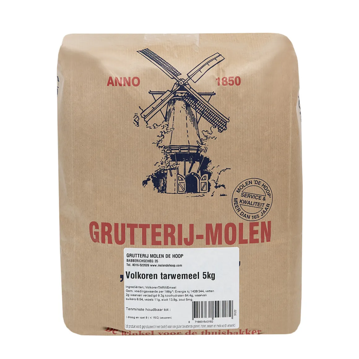 Op de molenstenen gemalen volkorentarwemeel, zonder extra toevoegingen. Je kunt tarwemeel gebruiken om heerlijke gezondere broden, koeken, cakes en andere gerechten te maken.