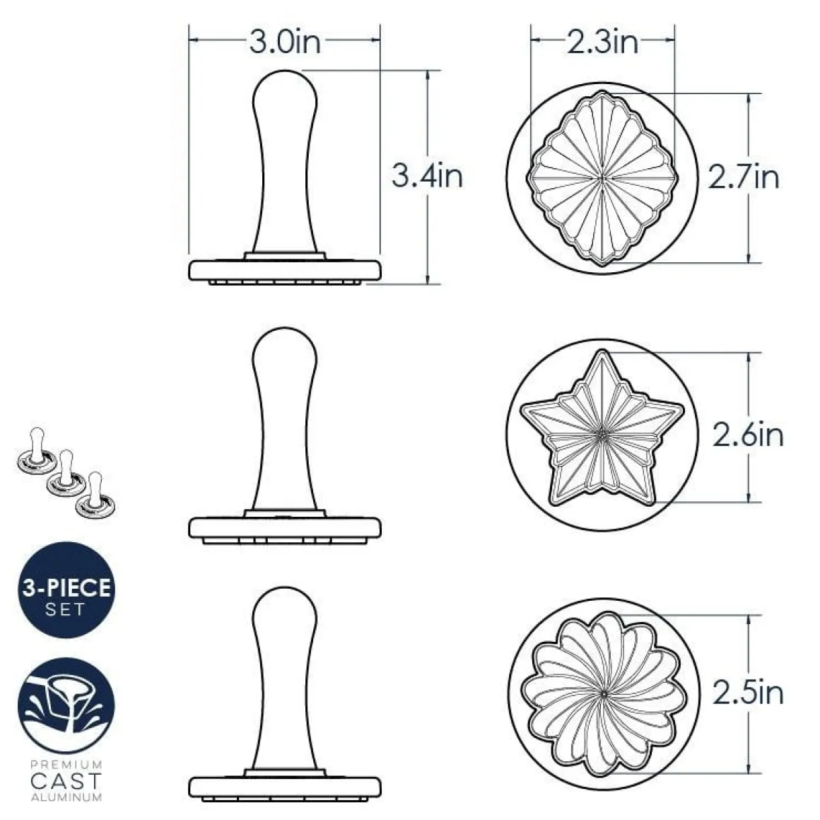Zeer degelijke koekjesstempels van het merk Nordic Ware. Deze ‘cookie stamps’ zien er niet alleen mooi uit, ze werken ook fantastisch! Rol (koekjes)deeg uit en druk met de koekjesstempels eenvoudig gedetailleerde koekjes uit. Gebruik altijd koud deeg. Wanneer het plakkerig wordt kun je eenvoudig bloem of suiker gebruiken of de stempel licht invetten met olie. Deze set bestaat uit een ster, diamant en een bloem. Vervaardigd in Amerika van gegoten aluminium met een handvat van rood hardhout.