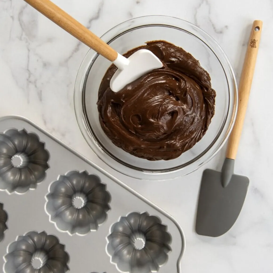 Een pannenlikker één van de handigste gereedschappen voor in de keuken, te gebruiken bij het goed leeg maken van beslag kommen of verpakkingen, het door scheppen van beslagen en sauzen en ga zo maar door. Deze pannenlikkers van Nordic Ware hebben een siliconen kop en een massief beukenhouten handvat. De siliconen koppen zijn hittebestendig tot 218°C (450°F). De set bestaat uit een grijze en witte pannenlikker.