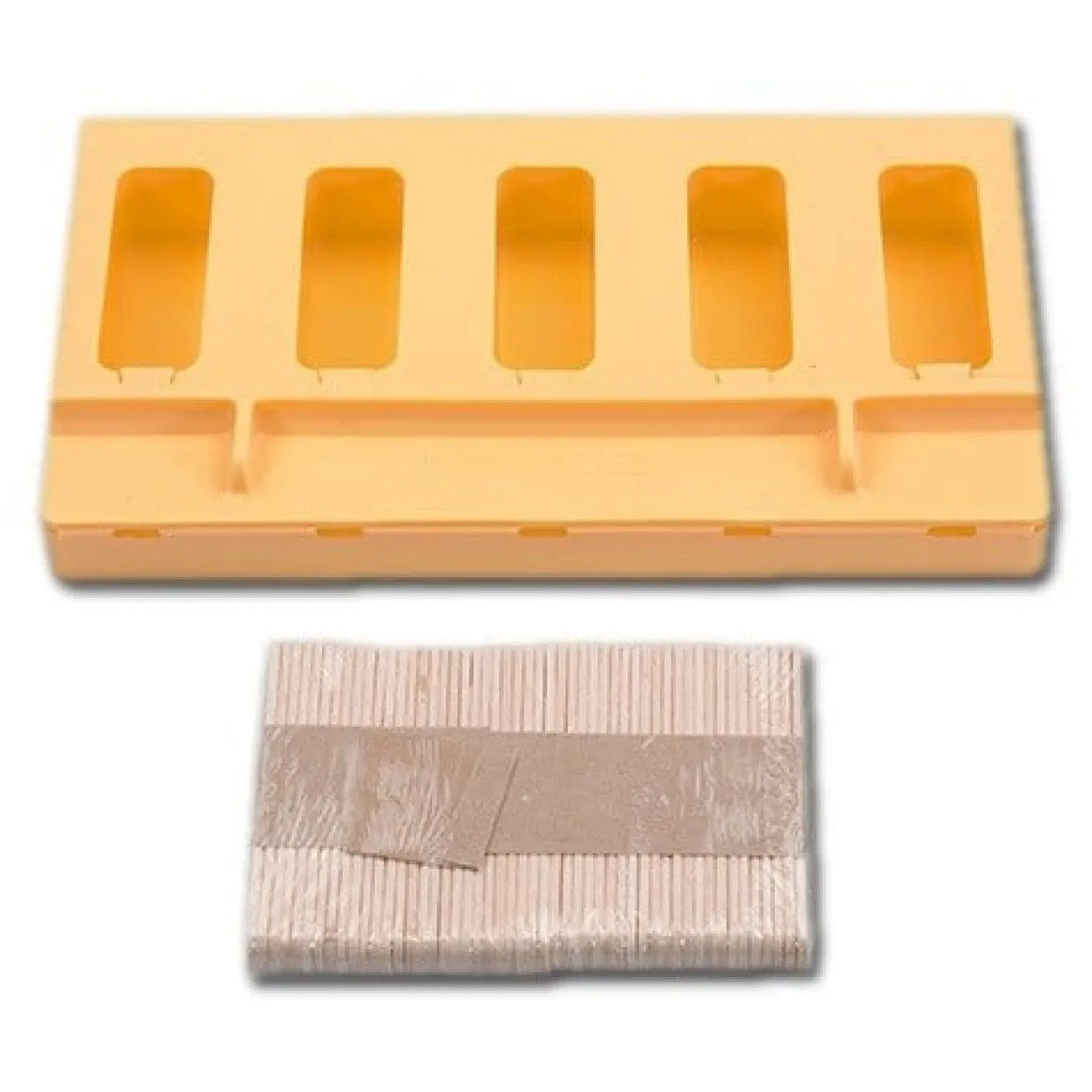 Deze mal is niet geschikt voor het maken van ijsjes van een dunne vloeistof (waterijsjes), de siroop zal dan door de openingen voor de stokjes weglopen.