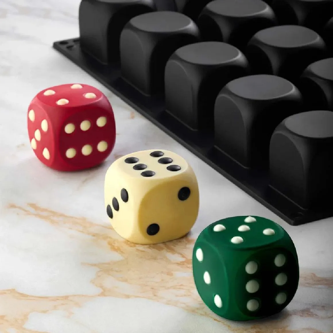 Maak bijvoorbeeld dobbelsteendesserts met een kern van mousse en een fluweelcoating of kleurrijke bonbons met een zachte vulling in deze siliconen vorm. De dobbelstenen zijn gewelidg bij onder meer spelletjesfeestjes of kinderevenementen, maar ook geschikt als originele toevoeging op dessertborden.