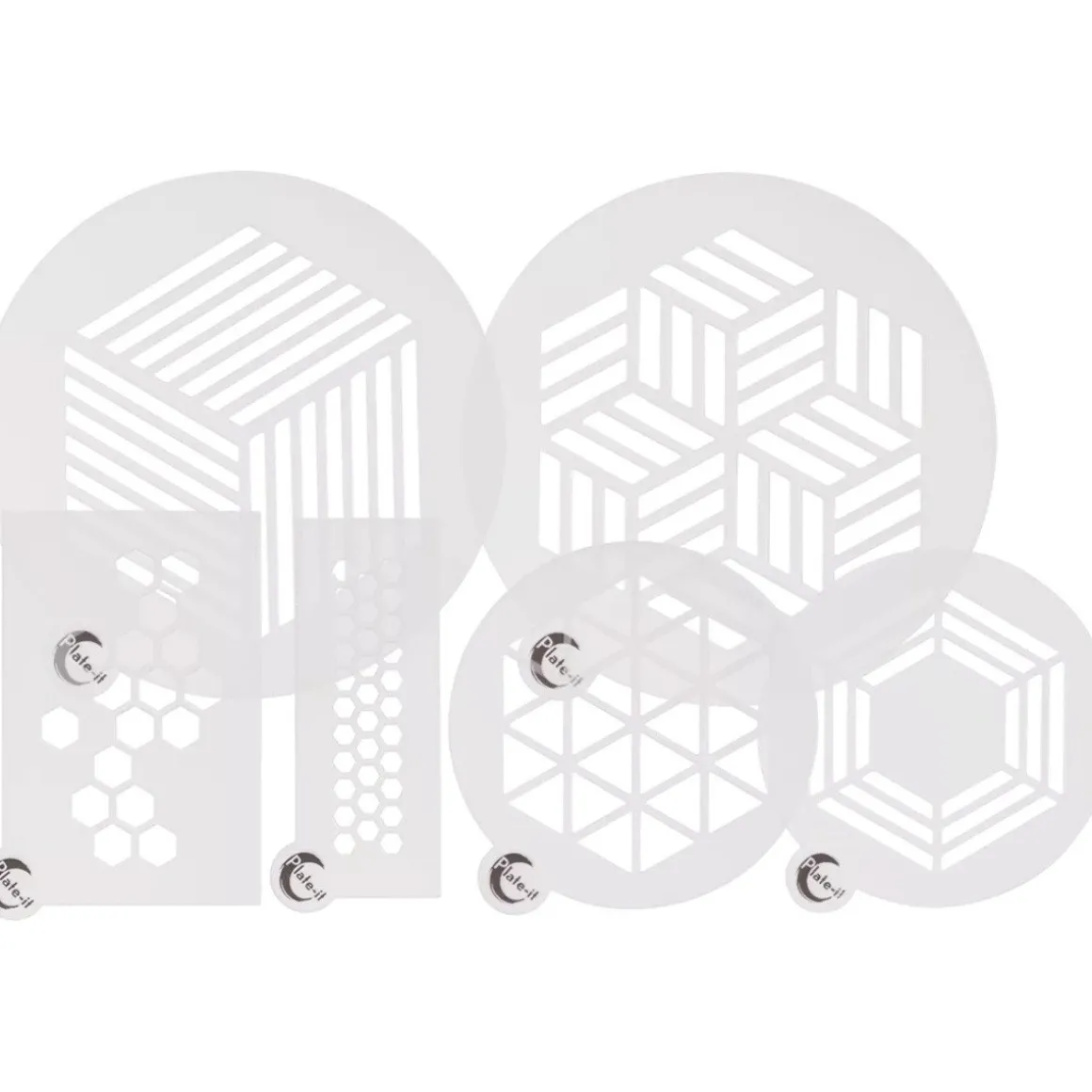 De Plate-it Stencil Hexagon Set/6 bestaat uit 6 verschillende stencils. De stencils hebben allemaal uitsneden van een hexagon vorm. Er zijn 2 stencils met kleine zeshoeken en de overige stencils bestaan uit een grote zeshoek met binnenin diverse andere vormen.