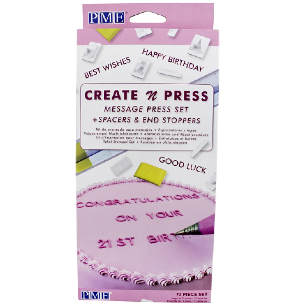 Met deze set van het merk PME kan je heel gemakkelijk letters en cijfers in je deeg, marsepein of rolfondant drukken. Deze set bestaat uit 70 cijfers en letters. Hiermee kan je alle woorden maken die je je maar kan bedenken. Verder heb je ook een mal waar de cijfers ingeschoven moeten worden en een begin en eindstuk zodat alles op de plek blijft.