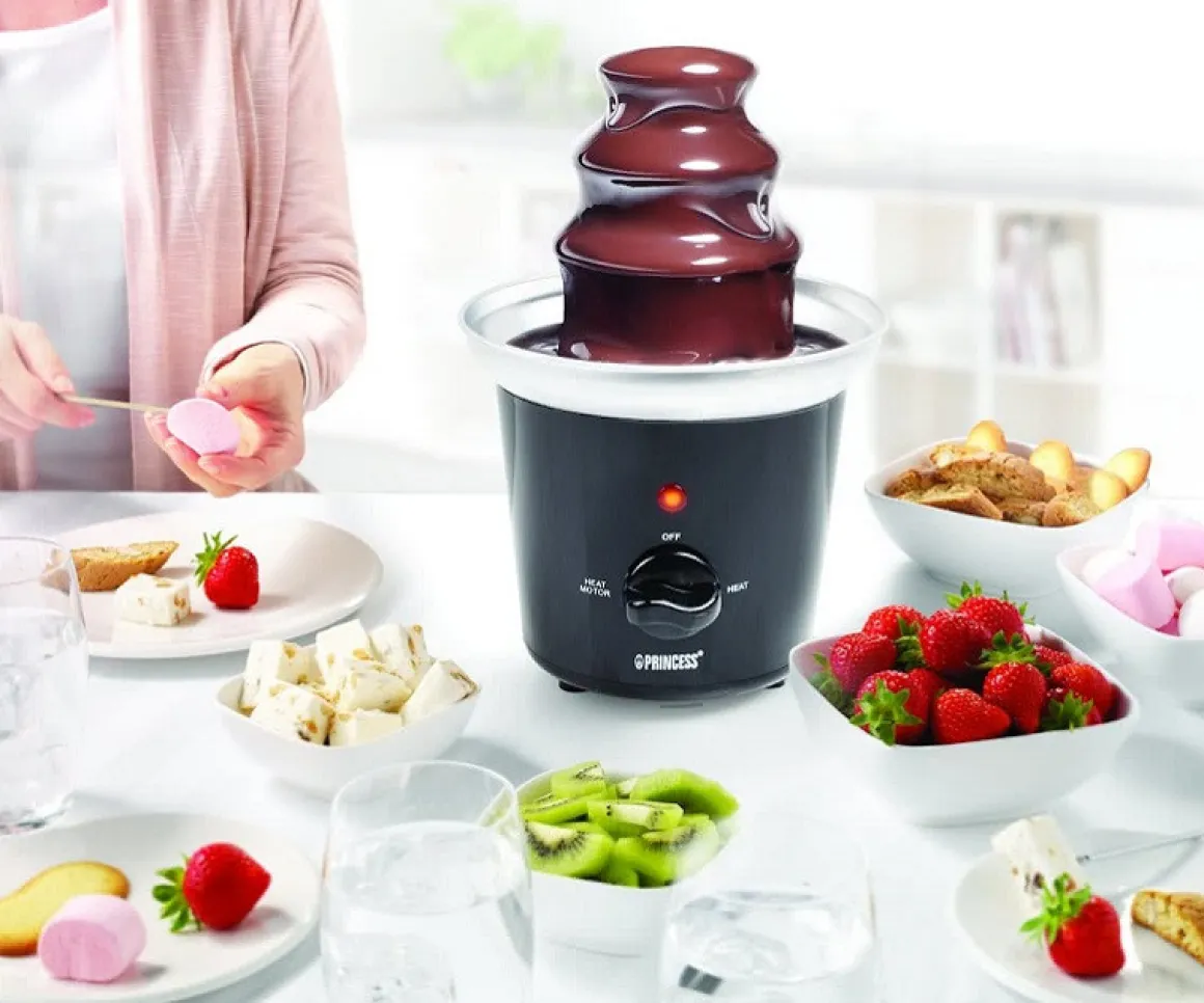 Leuke chocoladefontein van het merk Princess. Hiermee kun je marshmallows, snoep, fruit, koekjes, etc. in een handomdraai voorzien van een heerlijk chocoladelaagje. De fontein pompt en verwarmt de chocolade omhoog. De verwarming en pomp zijn apart schakelbaar.