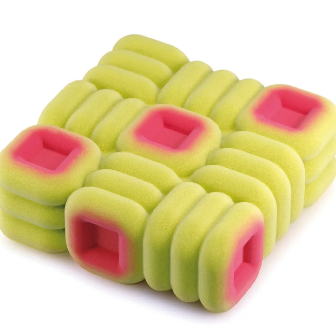 De Siliconen Vorm Cubik 18x18x6cm (Dinara Kasko) is een mal waarmee je kubusvormige desserts maakt. De buitenzijde van de vorm heeft geometrische lijnen met een vierkante elementen.