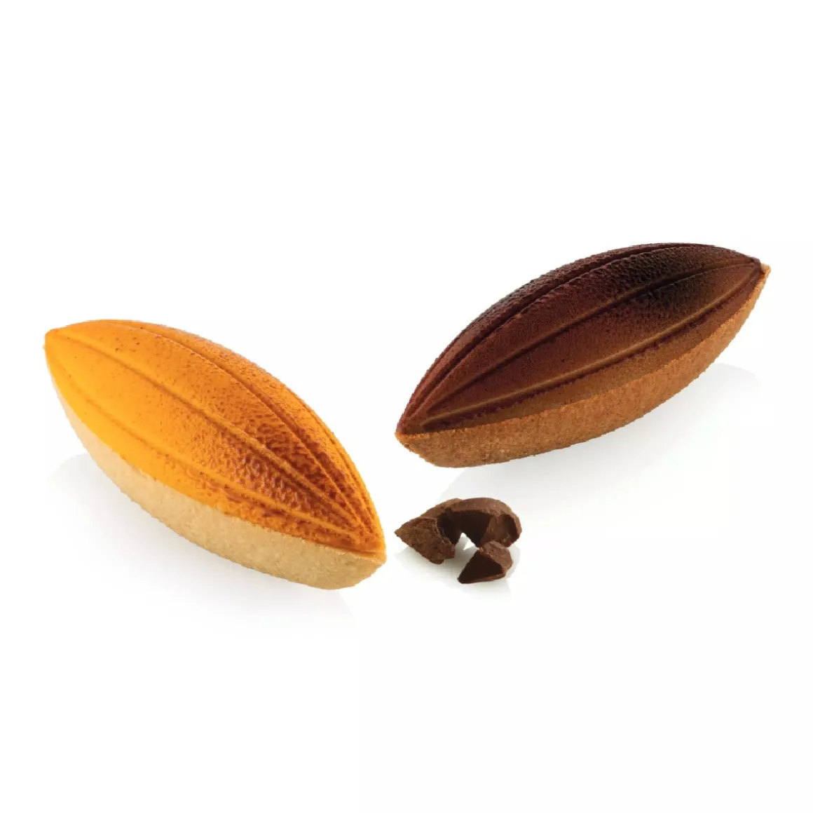 De Silikomart Siliconen Kit 3D Cabossa (6) 12x4cm is geïnspireerd op de cabossavrucht, de peul waarin cacaobonen groeien. Met deze kit maak je desserts in de vorm van een cabossa, langwerpig en licht gebogen. De set bestaat uit een siliconen mal met 6 holtes, een rode uitsteker en 6 zwarte geperforeerde vormen.