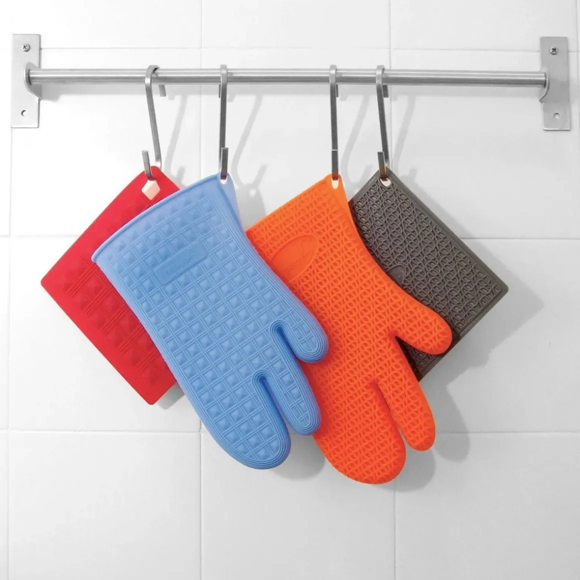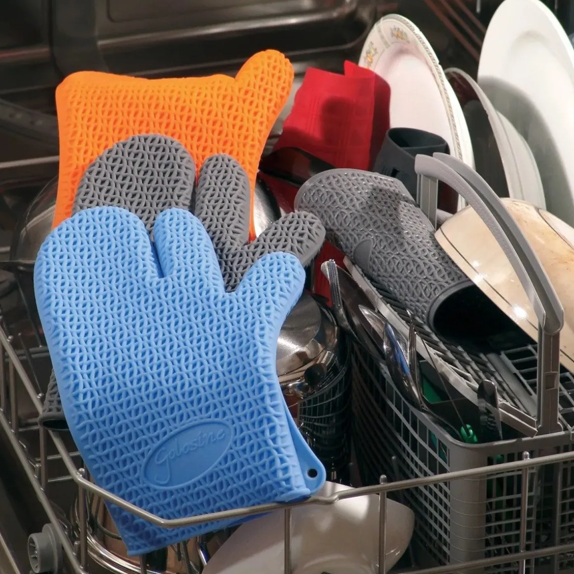 De handschoenen zijn ideaal om hete pannen van het fornuis te halen, voor bescherming tegen warme vloeistoffen of bakvormen uit de oven te halen. Verder is de handschoen voorzien van aan anti-slip materiaal, een losse duim en wijsvinger en een grijze kleur.