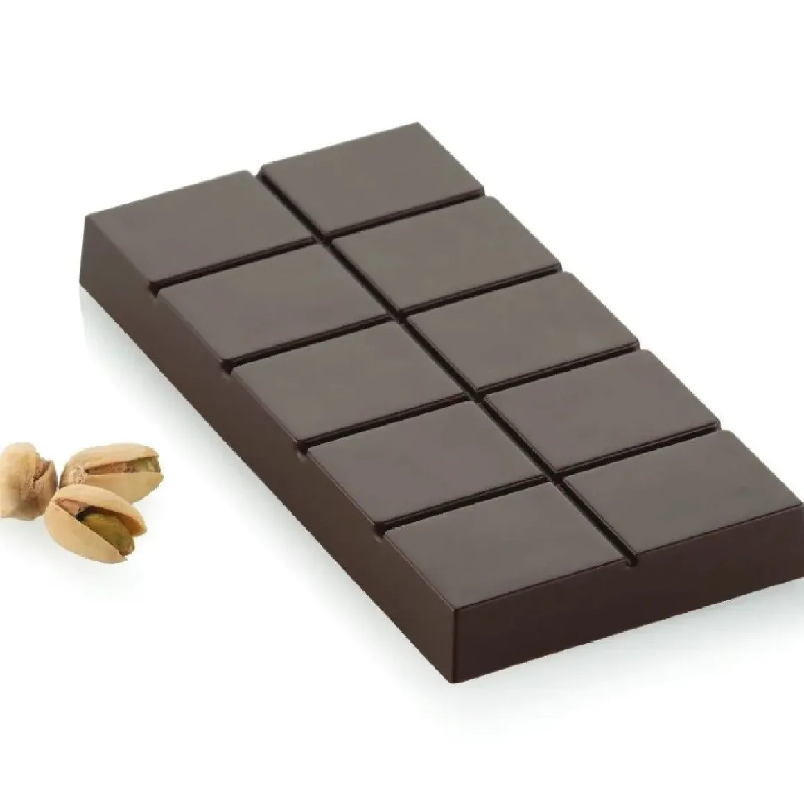 Met de Silikomart Siliconen Tablet Vorm Dubai (10 vaks) 15,5×7,5×5,5cm maak je zelf de populaire Dubai reep! De Dubai reep is een heerlijke chocoladereep gevuld met pistachecrème en kadayif. Deze vorm heeft een dikte van 1,5 centimeter, waardoor deze ideaal is voor het creëren van een goed gevulde chocoladereep.