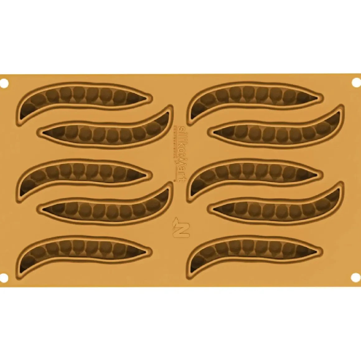 Maak bijzondere lekkernijen met de Silikomart Siliconen Vorm Peul (10x) 11×3,5×1,2cm. De mal heeft 10 holtes in de vorm van een peul. Deze peulen hebben een lengte van 11 centimeter en een breedte van 3,5 centimeter. Verder zijn de erwtjes van de peul goed zichtbaar. Prachtig om een verrassend en orgineel lekkernij te creëren. Gebruik de mal bijvoorbeeld om mousse of crème in te maken.