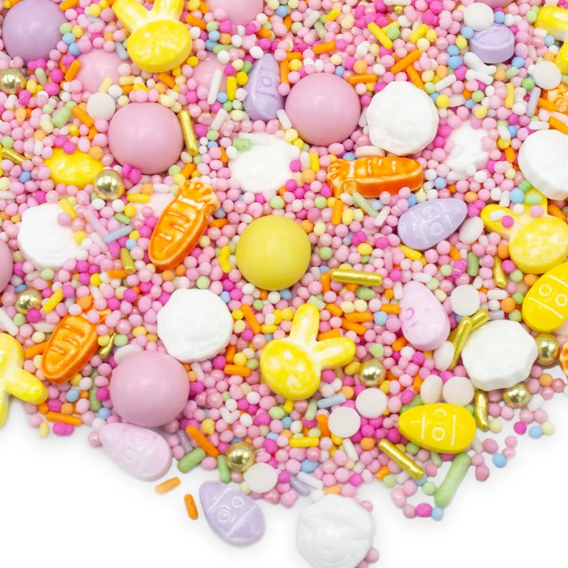 Een van onze absolute favoriete paasmixen! Onze Happy Easter strooimix combineert alles wat je van Pasen mag verwachten: super schattige gele konijntjes, veel gele en roze eieren en worteltjes. Gecombineerd met heerlijke chocoladebolletjes in wit, zachtroze en goud met veel witte confetti en roze nonpareilles, is deze paasmix een absolute topper in elk paasmandje en vervolgens op elke paastaart!