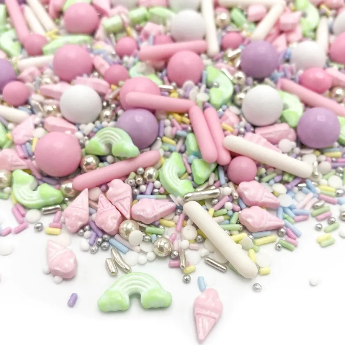 Als de zomer begint schreeuwen we allemaal om ijs! IJs werkt altijd voor een beetje afkoeling in de zomer. Deze Sprinkles I Scream Ice zijn daarom ook perfect om in de zomer te gebruiken voor op je cake, cupcake, donut, taart of andere lekkernijen. De Sprinkles hebben een kleurcombinatie van roze, groen, wit en paars. De basis van pasteltinten en zilveren strengen en parels past perfect bij de kleine regenbogen en ijshoorntjes die deze mix zo bijzonder maken.