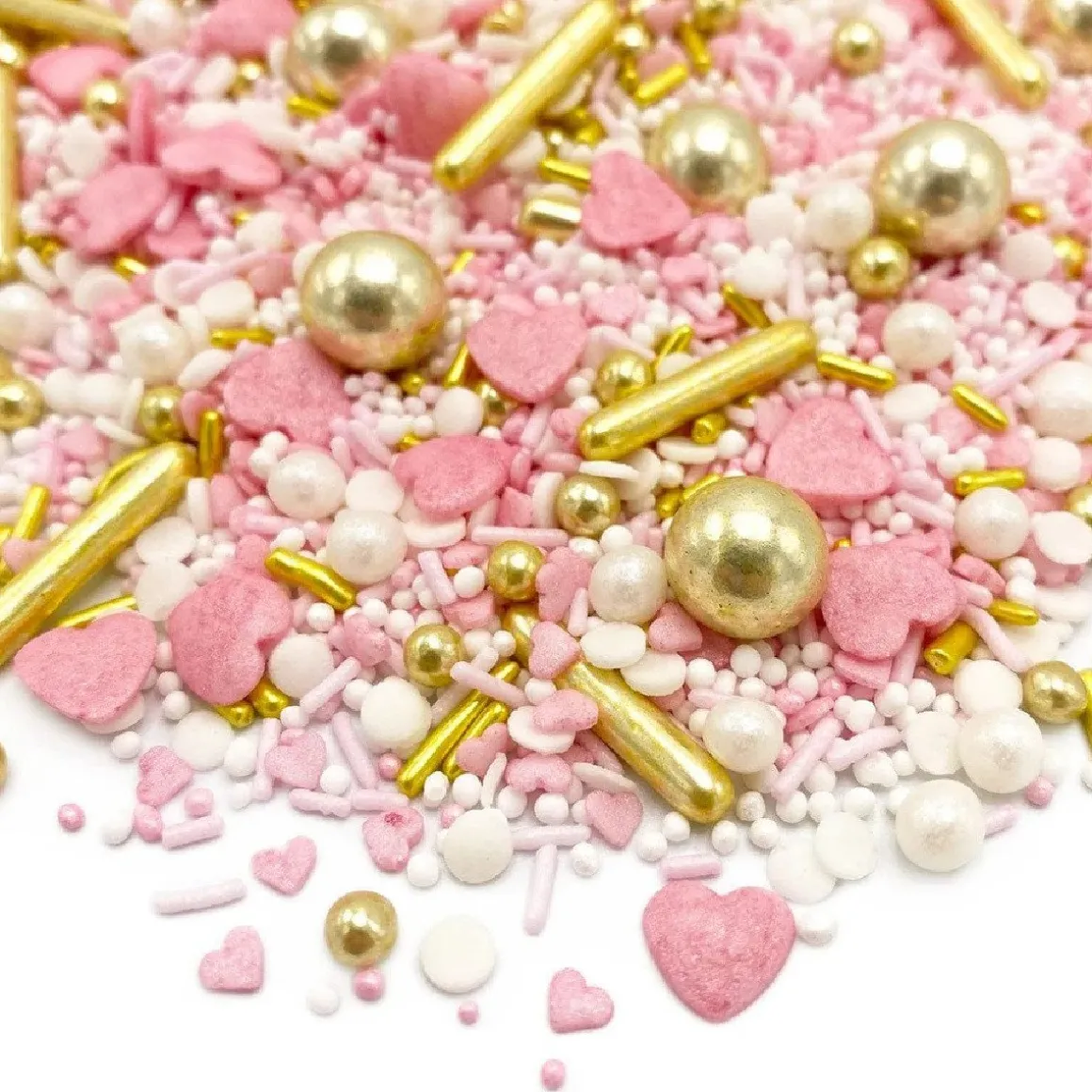 De Sprinkles Princess Diary 500g zijn kant-en-klare strooisels, die te gebruiken zijn op vele lekkernijen. Deze mix bestaat uit roze, witte en gouden kleuren en bevat onder meer parels, hartjes, hagelslag en decoratieve staafjes.