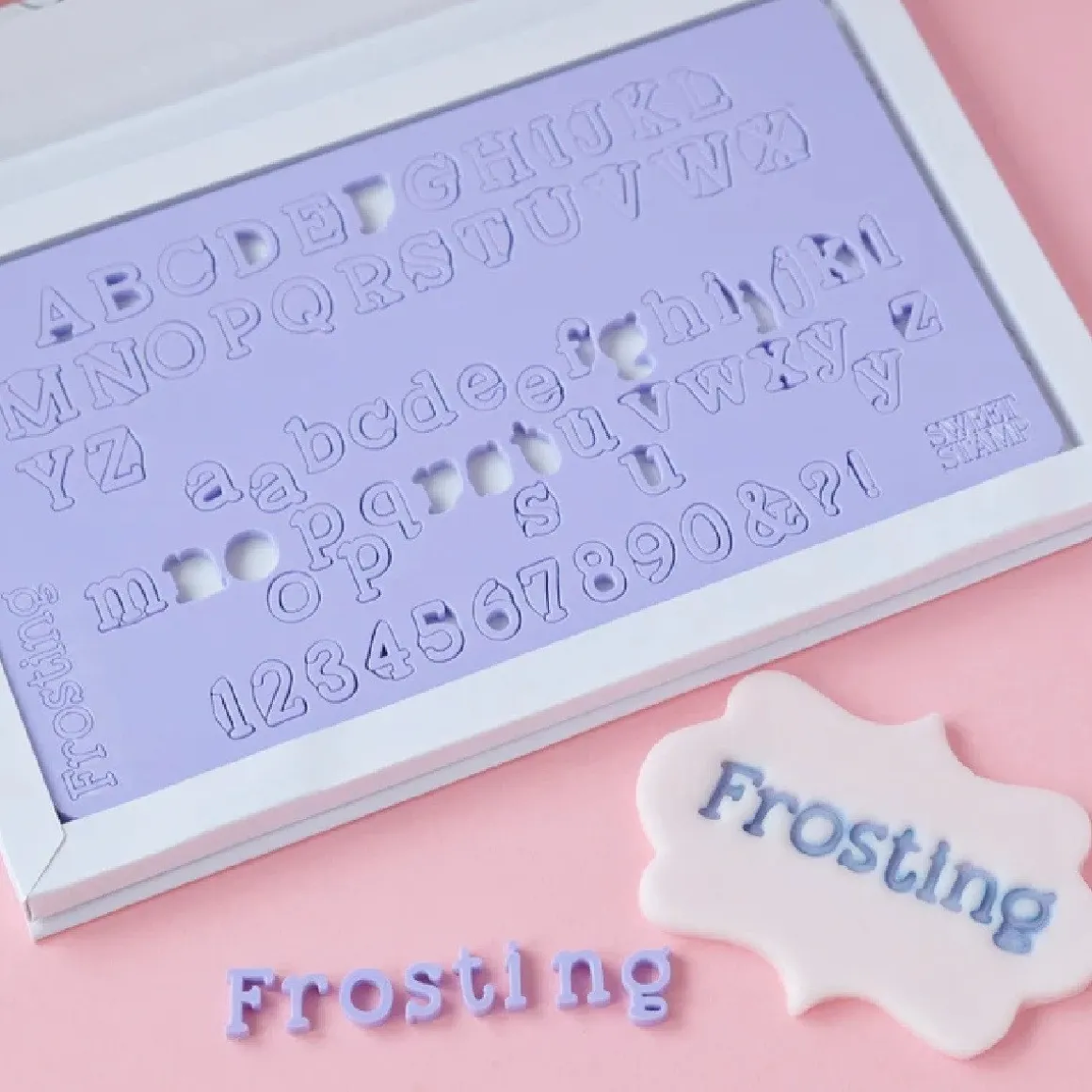 Sweet Stamp Frosting Letters & Cijfers Set bestaat uit letters, cijfers en symbolen in een klein formaat. Met deze set kun je eenvoudig een boodschap of naam als een soort reliëf in fondant maken en deze eventueel inkleuren met eetbare verf. Het is ook leuk om de letters te vullen met kleine eetbare strooisels, zoals musketzaad en gekleurd suiker. Je drukt de letters dus als het ware in het fondant, wat een erg leuk effect geeft. Breng het fondant met daarop de boodschap bijvoorbeeld aan op taarten, koeken of cupcakes.