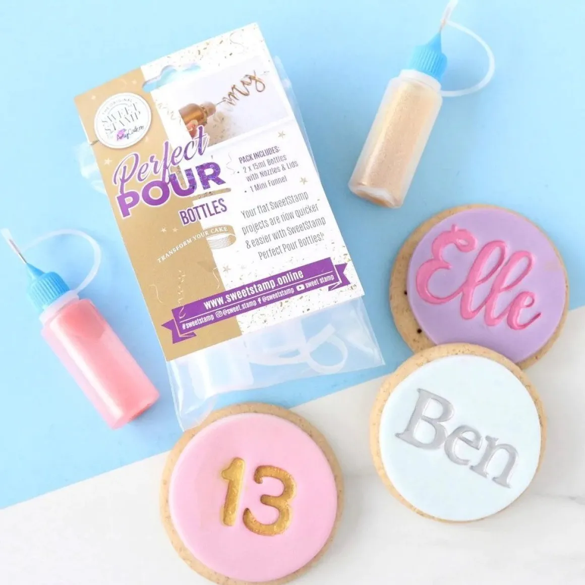 Met de Sweet Stamp Perfect Pour Bottles Set/2 wordt het onwijs eenvoudig om indrukken in fondant en dergelijke in te kleuren met eetbare verf. Maak bijvoorbeeld met een Sweet Stamp Element of Sweet Stamp Letter Set mooie indrukken in fondant en gebruik de Sweet Stamp Perfect Pour Bottles Set/2 om die afbeeldingen prachtig in te kleuren.
