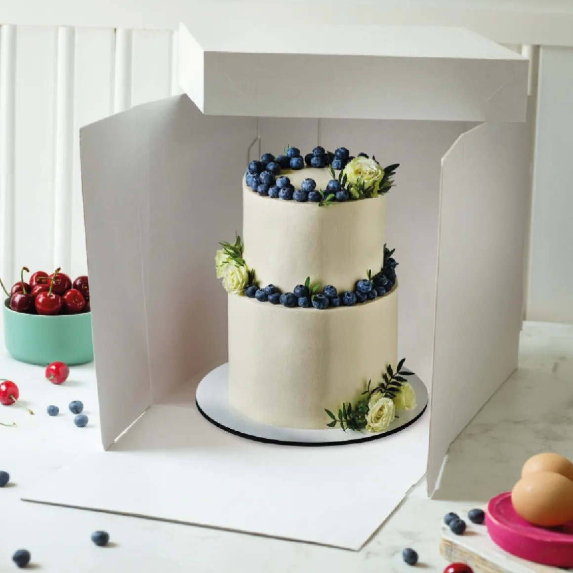 Deze Taartdoos 30,5×30,5x25cm is gemaakt om eenvoudig een taart in en uit de doos te halen. Dit komt door de innoverende opening. Deze bevindt zich aan de voorkant. Deze flap valt open wanneer er geen deksel op zit. Hierdoor kan de taart zonder te beschadigen erin geplaatst of eruit gehaald worden.