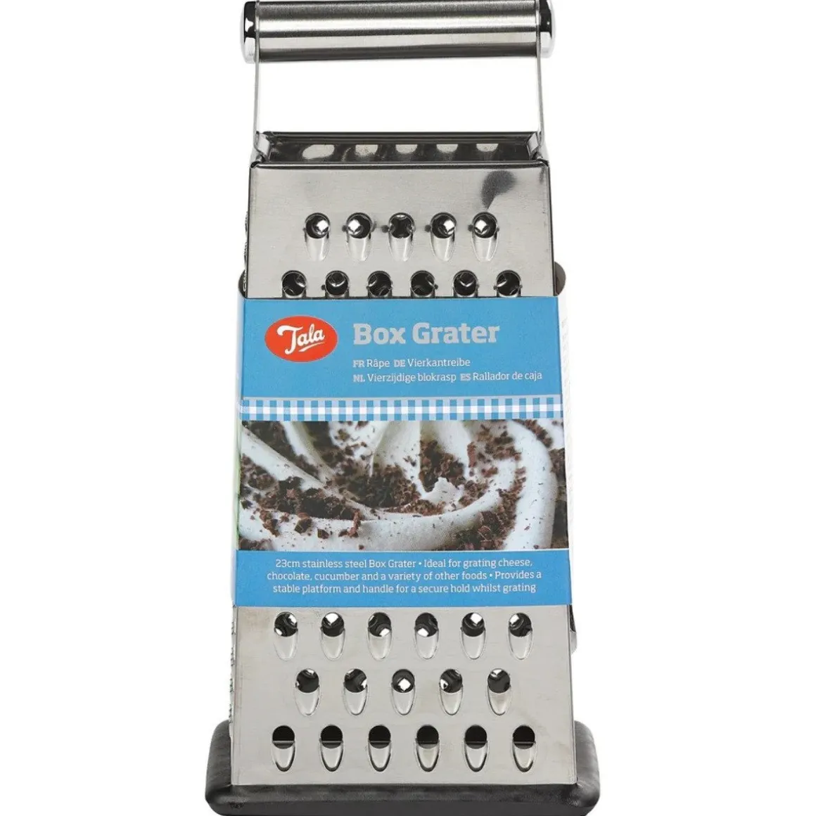 De Tala Blokrasp Vierzijdig RVS 23cm is een veelzijdige rasp. De rasp heeft vier verschillende kanten, waarmee je voedingsmiddelen van grof tot fijn kunt raspen. Dit handige product is gemaakt van roestvrijstaal en is erg stabiel door het antislip rubber aan de onderkant. Ideaal te gebruiken om bijvoorbeeld kaas, chocolade of komkommer te raspen. Het product is vaatwasserbestendig.