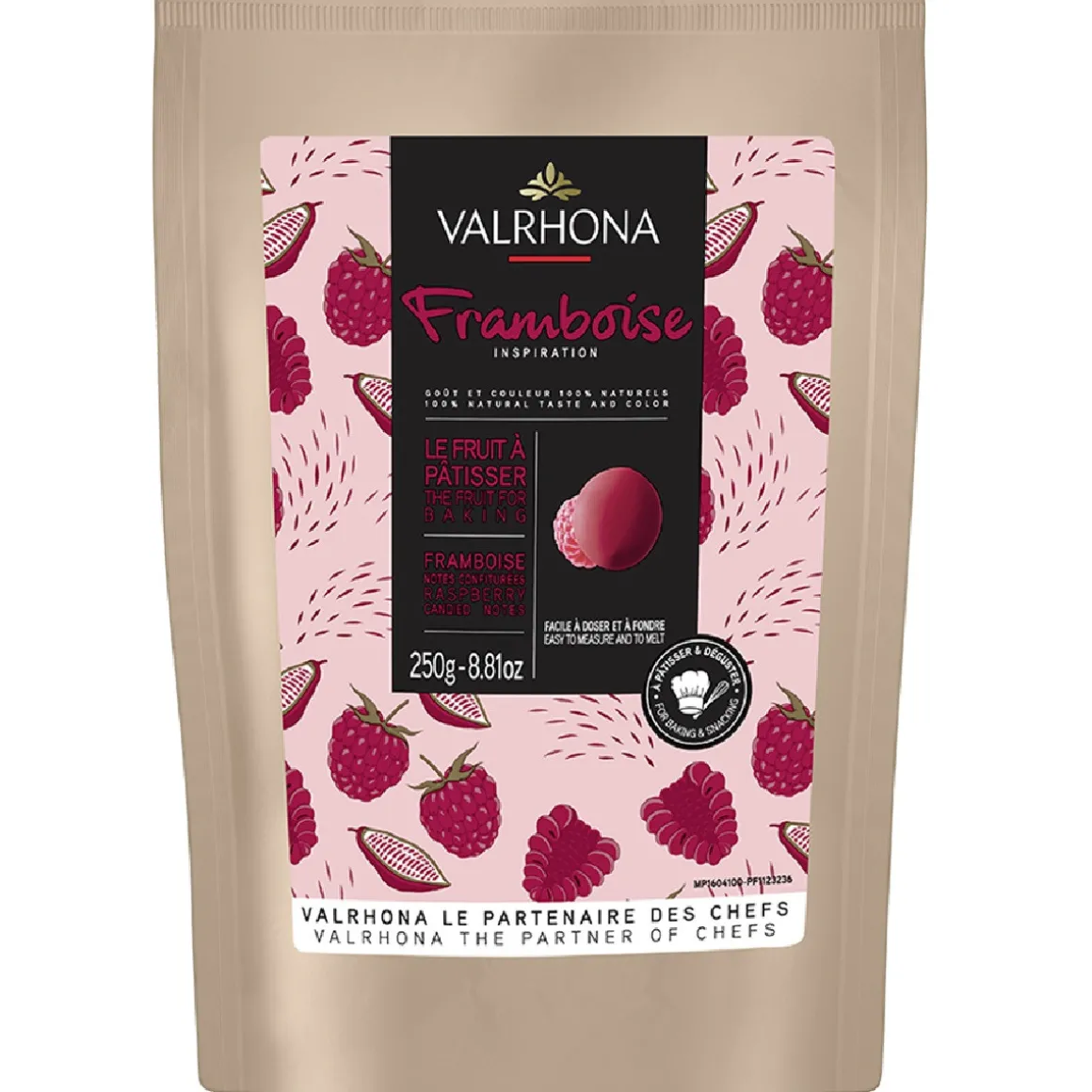 De Valrhona Chocolade Druppels Framboos 250g combineren de intense smaak van framboos met de romige zachtheid van cacaoboter. Gebruik deze frambozendruppels bijvoorbeeld voor het maken van luchtige mousses, romige crèmemengsels of een zachte ganache. Ze zijn ook perfect om repen of bonbons mee te creëren. Daarnaast geven de frambozendruppels een heerlijke friszure smaak aan taarten en gebakjes.